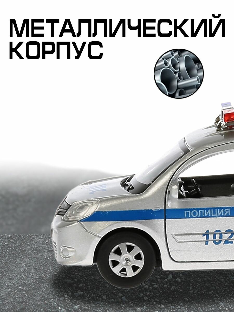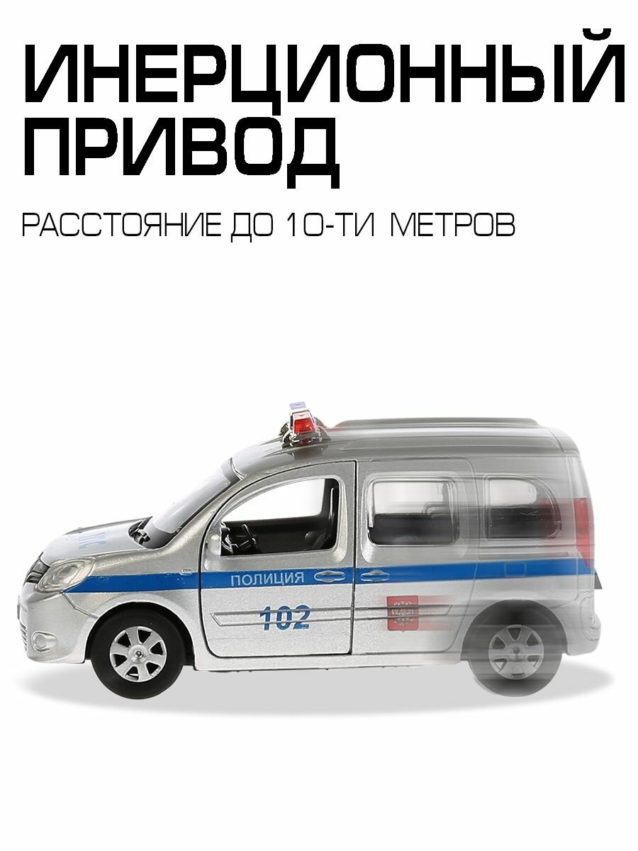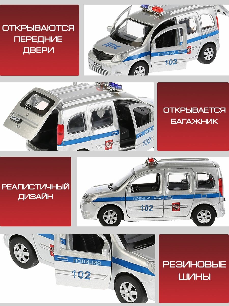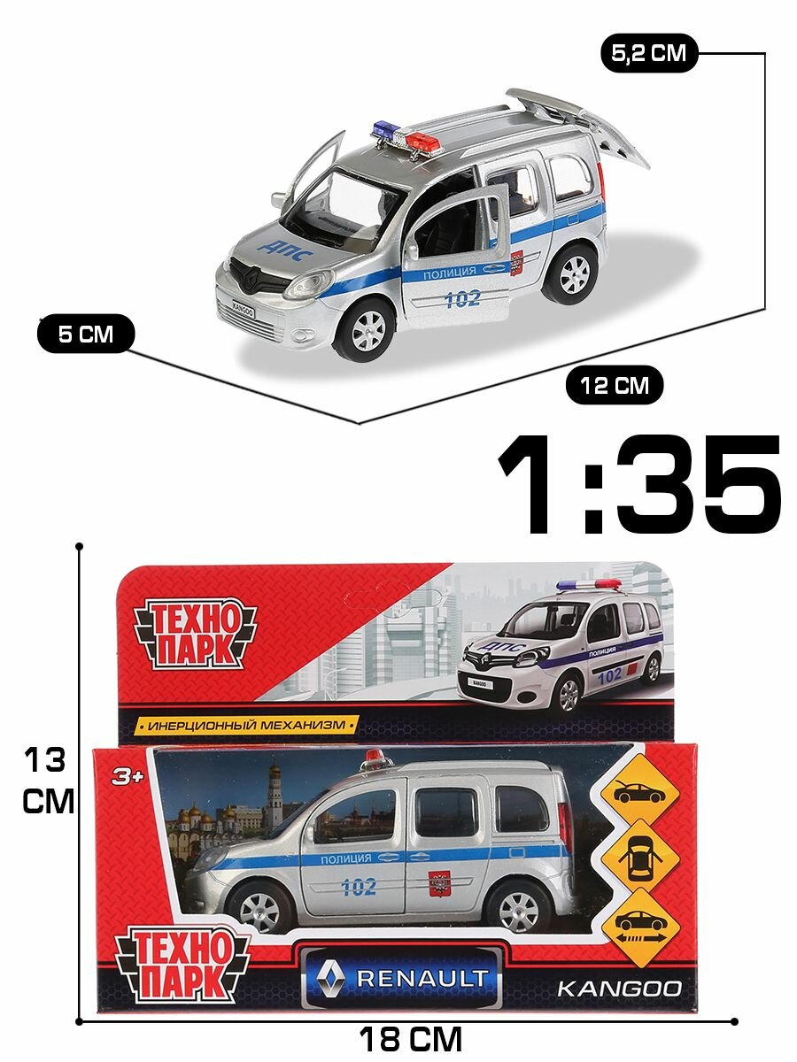 Машинка Renault Kangoo Полиция ТМ Технопарк представляет собой точную лицензионную копию настоящей. Это металлическая модель, выполненная в серебристом цвете с синей полоской, надписями ДПС и Полиция 102. У машинки открываются двери и багажник, можно рассмотреть салон внутри. Сверху установлены проблесковые маячки. Оснащена инерционным механизмом: если поставить машинку на ровную поверхность, потянуть за корпус и отпустить, то она поедет сама. Развивает мелкую моторику, воображение, расширяет кругозор.