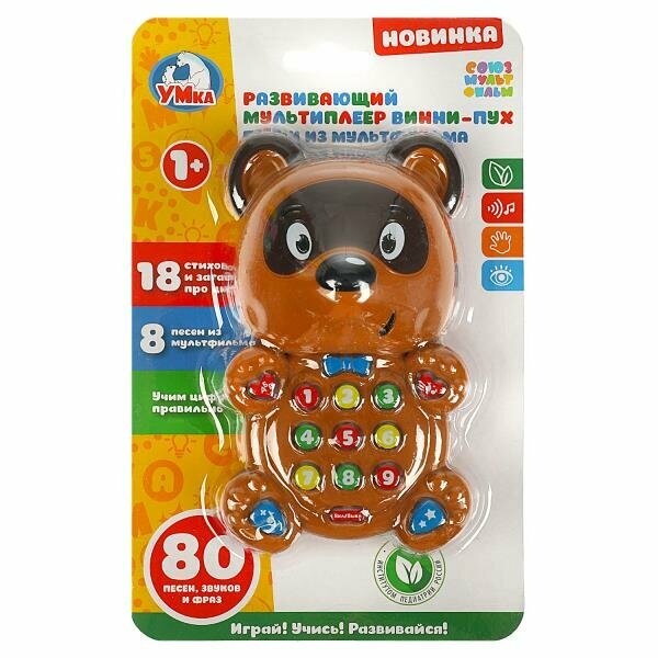 Новинка! Интерактивный мультиплеер «Винни-Пух» ТМ «УМка» - без сомнения понравится вашему малышу и подойдёт для развития творческих способностей ребёнка. Нажимая на кнопочки яркой игрушки в виде любимого персонажа, малыш услышит 80 песен звуков и фраз::- 18 стихов и загадок про цифры- 8 любимых песен из мультфильма- звуки телефона- фразыРебёнка очень порадует функционал мультиплеера:- учим цифры правильно- световые эффекты (кнопочки светятся)- выбор режима работы- регулировка громкости- динамикЯркая музыкальная игрушка ТМ «УМка» создана для успешного развития ребёнка и обучения цифрам.Развивает:- память- музыкальный слух - тактильные навыки- визуальное восприятие - моторику- координацию движений Растите и развивайте вашего малыша вместе с музыкальными игрушками ТМ «УМка»! Одобрено Институтом педиатрии России.Материал: пластмасса,металл. Работает от 3 батарейками типа ААА. Цвет в ассортименте.Рекомендовано для детей от 1 года.