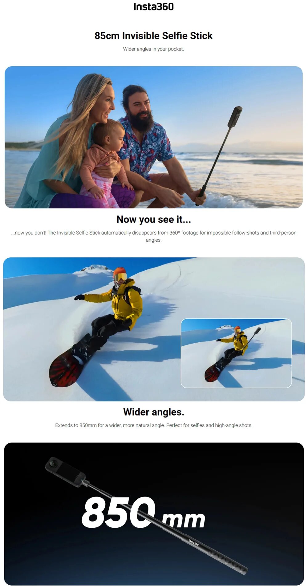 «Невидимая» селфи-палка для камеры Insta360 One X. Камера автоматически распознает и удаляет ее из фотоснимков и видео. Минимальная длина: 28.5 см, максимальная: 120 см. В основании есть штативное гнездо под винт 1/4"-20, что позволяет закреплять палку на различных штативах и других держателях. Материал: алюминий.
