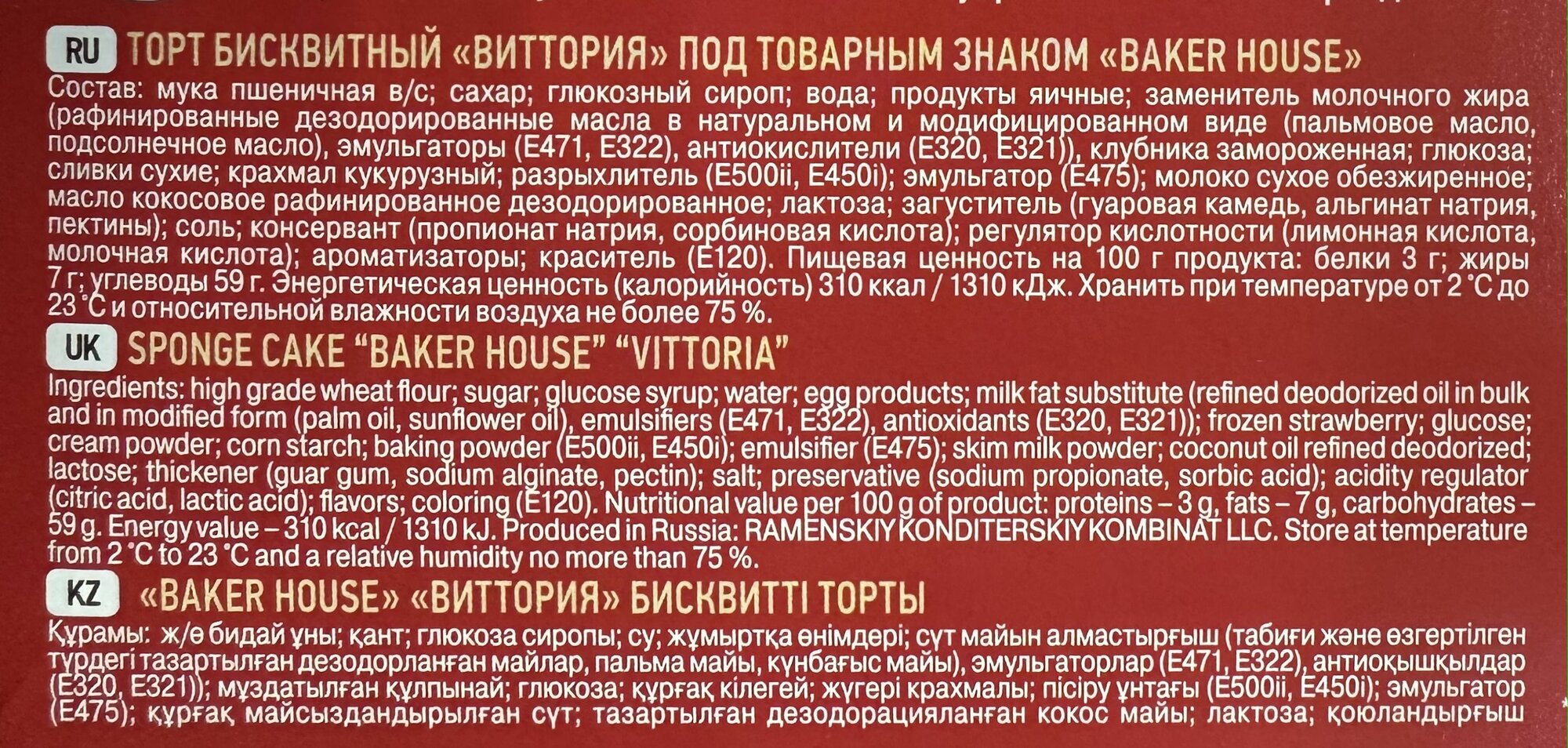 | Состав | Мука пшеничная в/с, сахар, глюкозный сироп, вода, продукты яичные, заменитель молочного жира (рафинированные дезодорированные масла в натуральном и модифицированном виде (пальмовое масло, подсолнечное масло), эмульгаторы (Е471, Е322), антиокислители (Е320, Е321)), клубника замороженная, кокосовая стружка, глюкоза, сливки сухие, крахмал кукурузный, разрыхлитель (Е500ii, E450i), сыворотка молочная сухая, эмульгатор (Е475), какао-порошок, масло кокосовое рафинированное дезодорированное, влагоудерживающий агент (глицерин), лактоза, загуститель (гуаровая камедь, альгинат натрия, пектины), соль, консервант (пропионат натрия, сорбиновая кислота), регулятор кислотности (лимонная кислота, аскорбиновая кислота), ароматизаторы, краситель (кармин) |