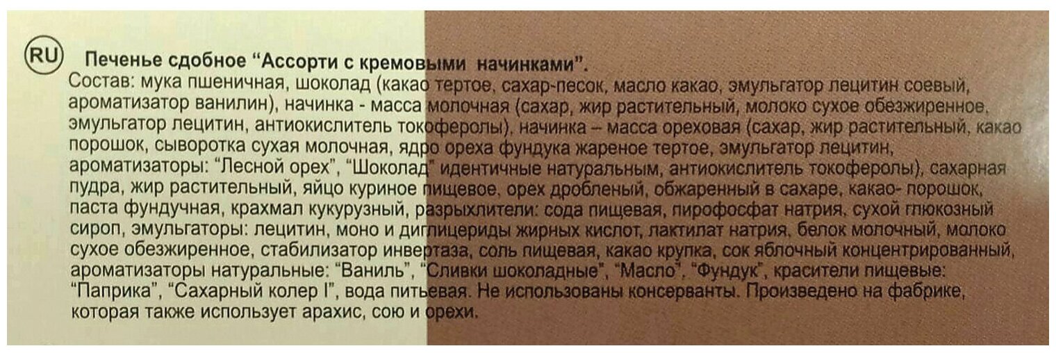 | Состав | Мука пшеничная хлебопекарная в.с., сахарная пудра, кондитерская глазурь (сахар-песок, растительный жир – заменитель какао-масла, какао тертое, какао-порошок, эмульгатор лецитин соевый, ароматизатор ванилин), растительный жир (фракции пальмового масла, антиокислитель лимонная кислота), начинка – кондитерская масса молочная (сахар-песок, жир кондитерский (смесь пальмового и подсолнечного масел, антиокислитель аскорбиновая кислота), сухое обезжиренное молоко, эмульгатор лецитин соевый), яйцо куриное пищевое, начинка – кондитерская масса ореховая (сахар-песок, жир кондитерский (смесь пальмового и подсолнечного масел, антиокислитель аскорбиновая кислота), какао-порошок, эмульгатор лецитин соевый, ароматизаторы |