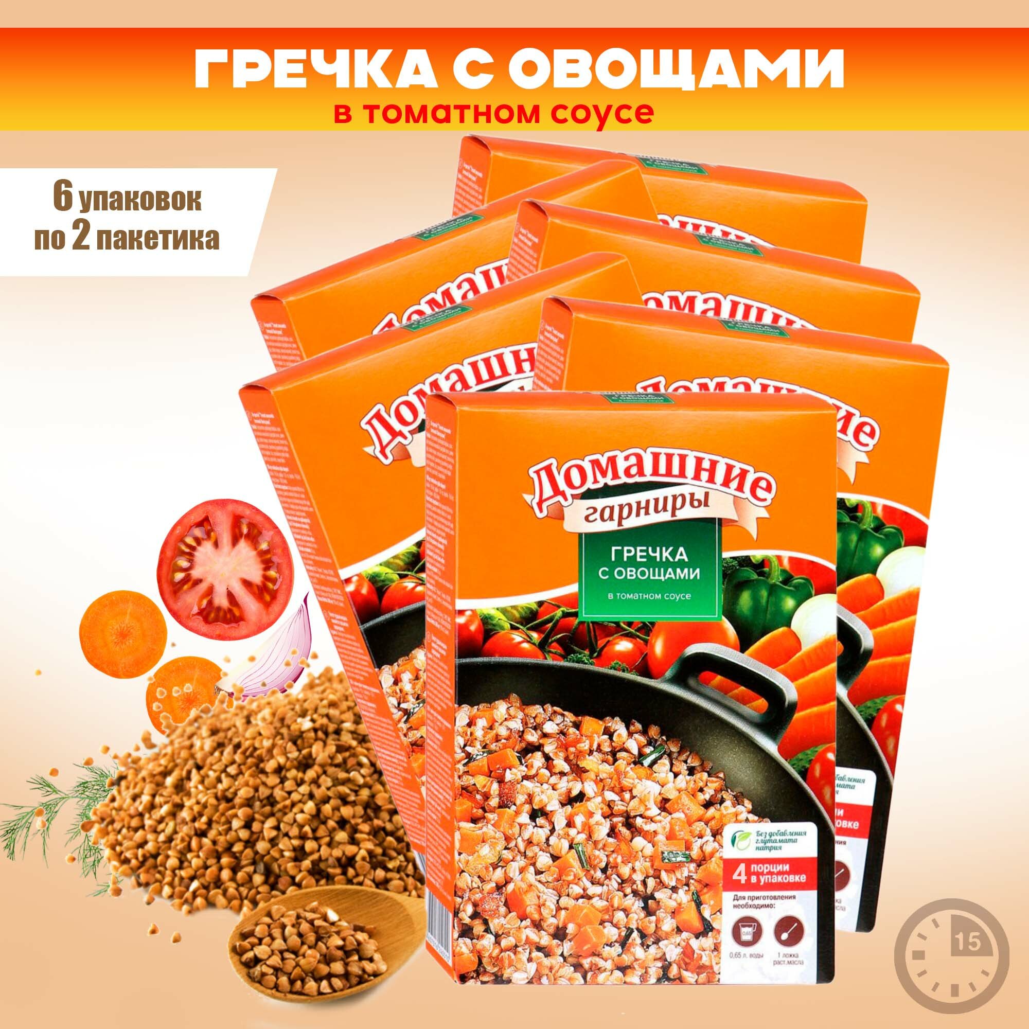 Гречка, конечно, «королева круп». Но это не значит, что королева не любит кулинарных экспериментов. Добавим родных овощей с грядки: морковку, лук и зеленый лук для особой весенней бодрости. И потомим для сочности в томатном соусе из спелых ароматных помидоров. Готово! Натуральный гарнир с интересным характером. Хорош как сам по себе, так и в сочетании с мясом.Натуральные и простые в приготовлении основы для создания традиционных блюд.Гречка с овощами в томатном соусе хороша в сочетании с мясом или курицей, а также как самостоятельное блюдо.Приготовить просто:Вскипятите 600 мл воды, засыпьте содержимое пакета, добавьте 1 столовую ложку растительного масла и перемешайте. Варите 15-17 минут на умеренном огне до готовности. Дайте немного настояться под крышкой.Масса нетто 1 уп: 300 г (2 пакетика по 150 г)В наборе 6 упаковок.