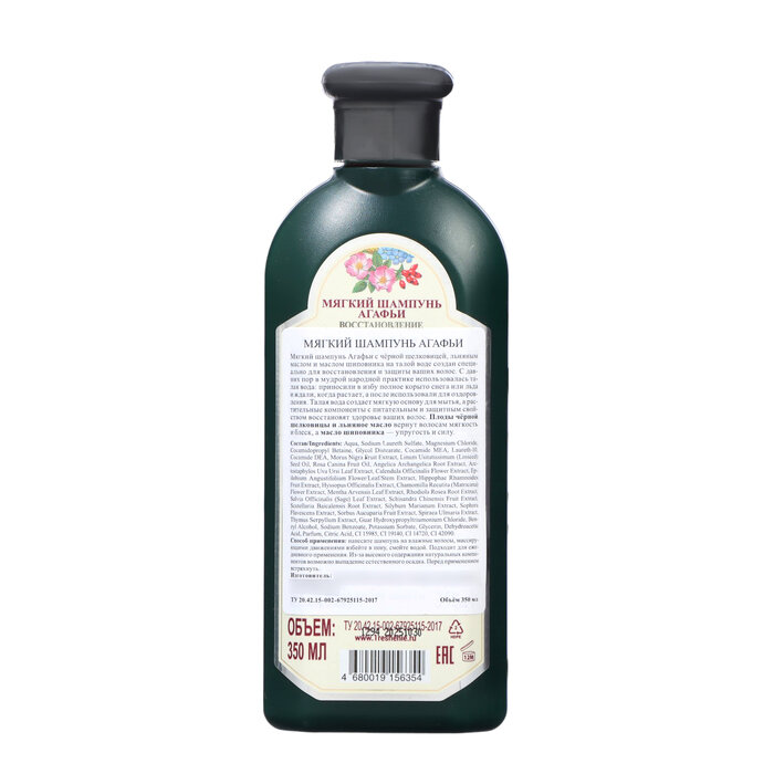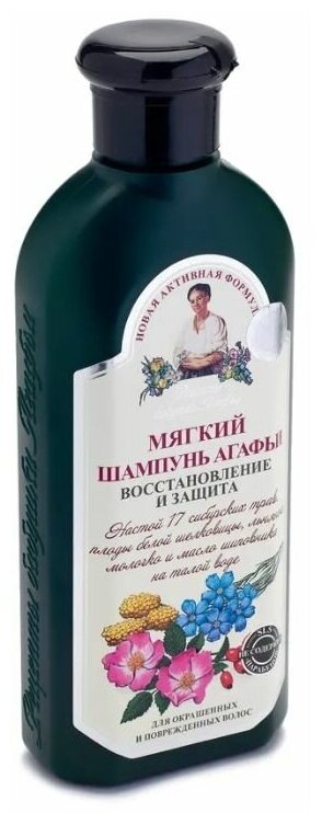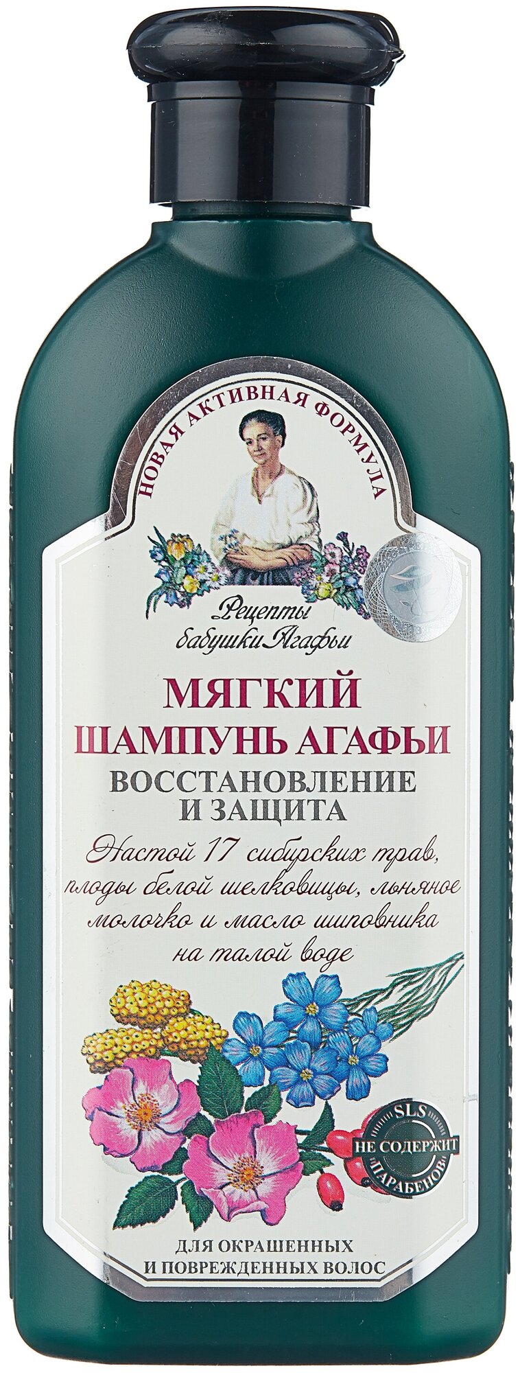 Шампунь Рецепты бабушки Агафьи Мягкий обогащен активными веществами, такими как плоды белой шелковицы, льняное молочко и масло шипо. Благодаря этому он глубоко проникает в структуру волос, укрепляя и питая их изнутри.