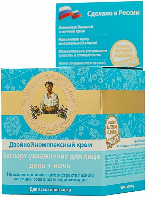 Двойной крем эксперт-увлажнение - это натуральное универсальное средство, созданное по рецептам сибирской травницы Агафьи, сочетающее в себе комплексный дневной и ночной уход. Его сверхлёгкая текстура быстро впитывается, насыщает влагой и микроэлементами, придаёт лицу свежесть, а коже - эластичность и чувство комфорта. Экстракт лесного жасмина содержит богатый витаминно-минеральный комплекс и является сильнейшим антиоксидантом, эффективно питает и восстанавливает кожу, повышает её тонус и упругость, сужает поры и защищает от негативного воздействия УФ-лучей. Сок алоэ и гидролипиды насыщают кожу живительной влагой, сохраняют длительный увлажняющий эффект, мгновенно устраняют сухость и стянутость кожи, дарят гладкость и шелковистость.