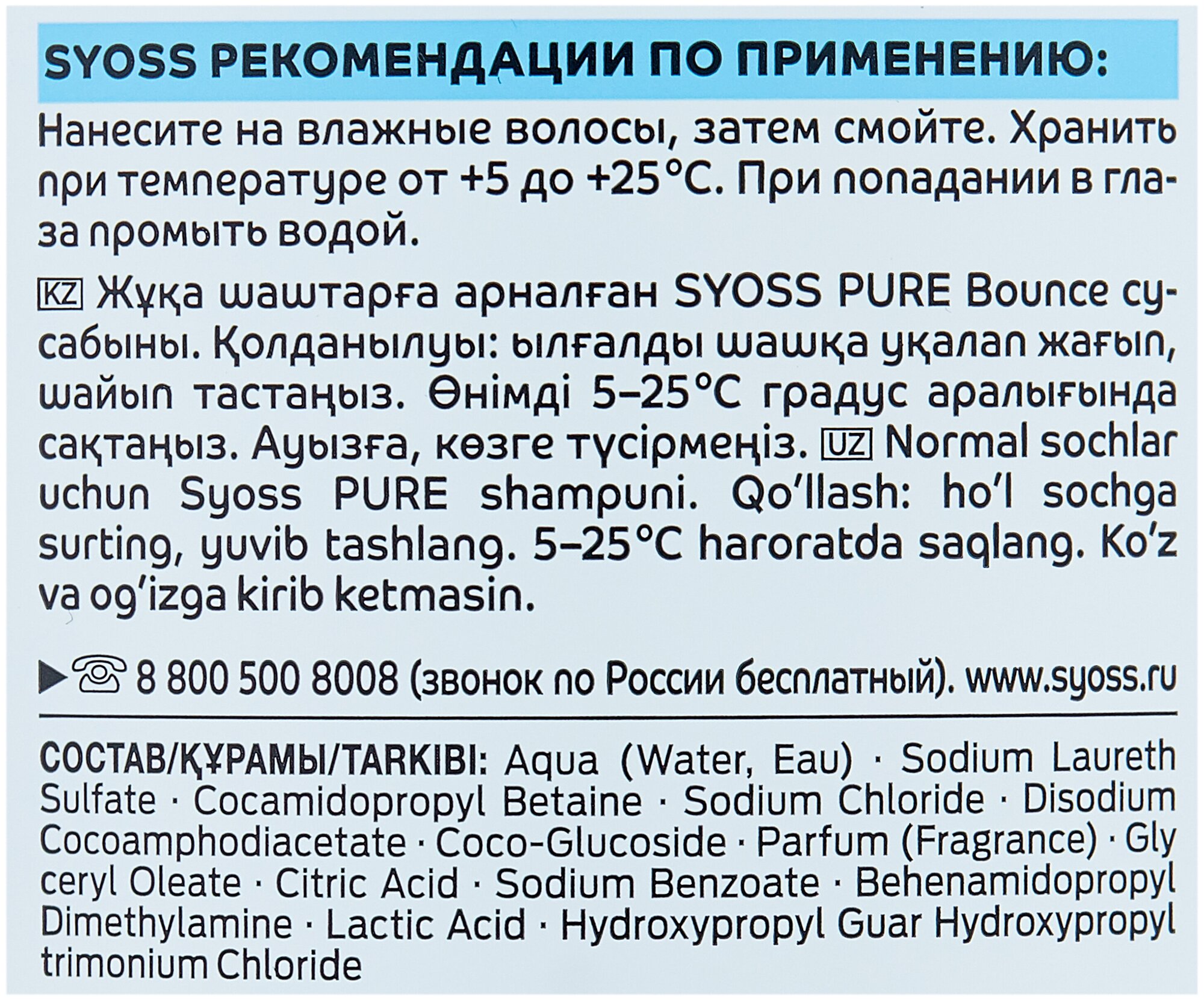Шампунь Syoss Pure Bounce мицеллярный для тонких волос эффективно очищает волосы и кожу головы, придает волосам упругость и воздушный объем, подходит для ежедневного использования. Не содержит силиконов, парабенов, минеральных масел и искусственных красителей.