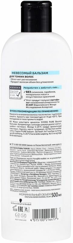 Бальзам Syoss Pure Bounce Невесомый для тонких волос облегчает расчесывание, придает волосам воздушный объем и упругость без утяжеления. Средство не содержит силиконов, парабенов, минеральных масел и искусственных красителей.