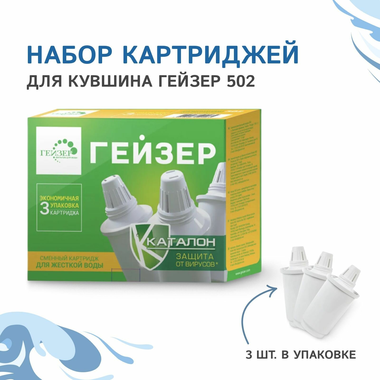 Набор из трех модулей 502. Для жесткой воды. Температура очищаемой воды не более 40°С.Картридж 502 применяется в фильтрах-кувшинах Гейзер для комплексной очистки и смягчения воды. Ресурс: 350 л. Производство: Россия.Сменные картриджи имеют одинаковые присоединительные размеры, взаимозаменяемы и могут устанавливаться в любой фильтр-кувшин Гейзер (а с использованием переходников — в кувшины других производителей).картридж 502 для жесткой воды имеет пять степеней очистки:Материал Каталон удаляет железо, тяжелые металлы, органические и хлорорганические соединения, бактерии и вирусы;Ионообменная смола для снижения жесткости воды;Высококачественный кокосовый уголь удаляет хлор, органические и хлорорганические соединения, устраняет неприятные запахи и привкусы воды;Серебро в металлической несмываемой форме для подавления жизнедеятельности болезнетворных бактерий;Механический постфильтр предотвращает вынос фильтрующих материалов в очищенную воду.