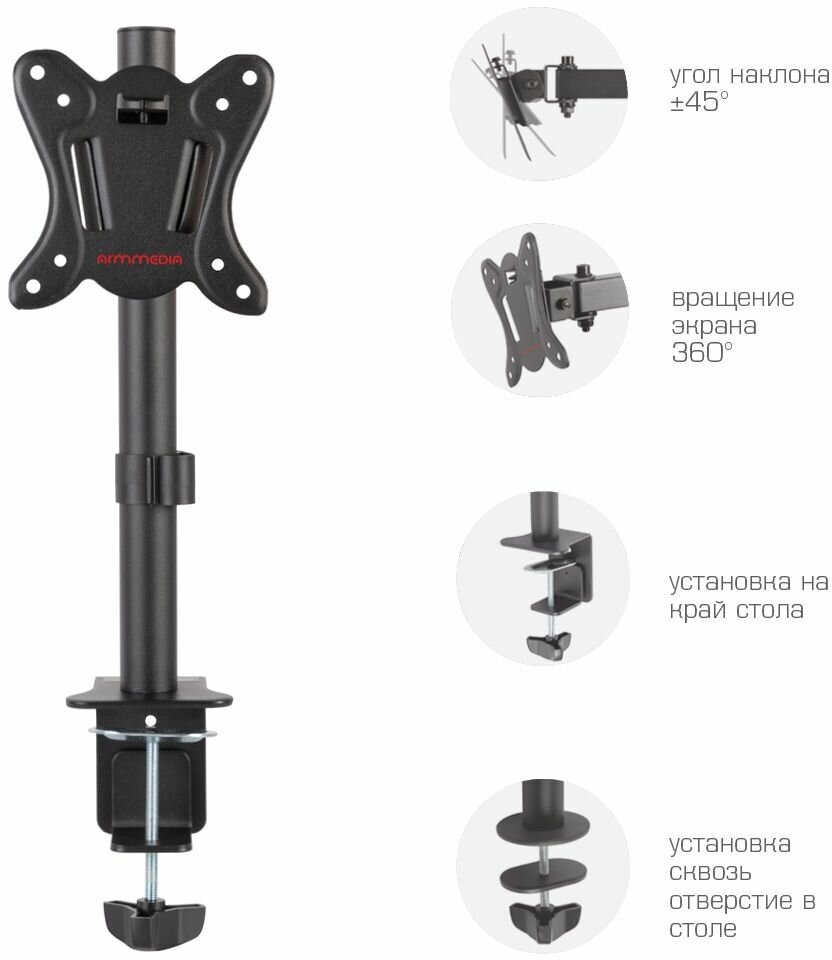 Кронштейн для ТВ мониторов Arm Media – это универсальный настольный крепеж для большинства моделей от 15 до 32 дюймов (от 38 до 81 см). Кронштейн Arm Media позволяет устанавливать экран в удобное положение, он свободно двигается в разных направлениях, его можно наклонять на ±45°, поворачивать на 360° вокруг штанги, изменять вылет и регулировать высоту установки экрана над столом. Высота штанги 400мм. Кронштейн ARM MEDIA рассчитан на максимальную нагрузку до 12 кг. Легкая установка и регулировка. Имеются специальные зажимы для проводов. Поддерживает стандарты VESA: 75x75, 100x100. В комплекте монтажный набор для крепления монитора.