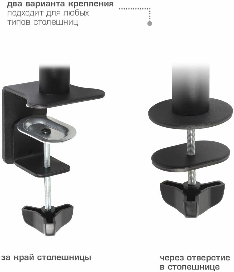 | Особенности | Регулируемое по высоте крепление. Мощная стальная конструкция. Кабель-каналы. Съемная монтажная пластина. Надёжное крепление к столу |