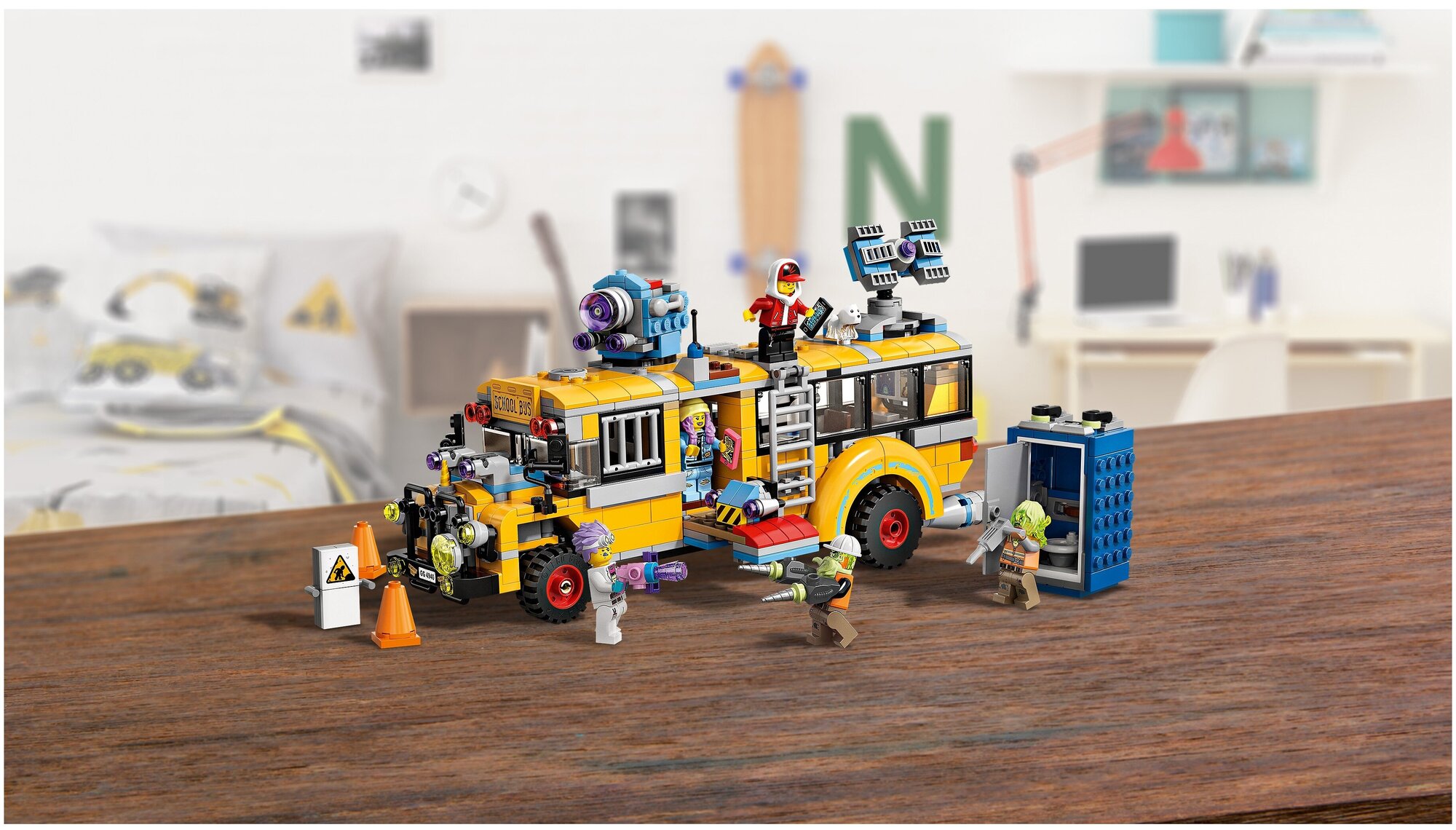 - Игрушечный школьный автобус оснащен выдвижным командным пунктом, раскладываемыми пушками против призраков и сканерами на крыше и вмещает 4 мини-фигурки. Портативный туалет может превратиться в призрачного монстра, плюющегося коричневыми плитками, ведь в игре можно и подурачиться!