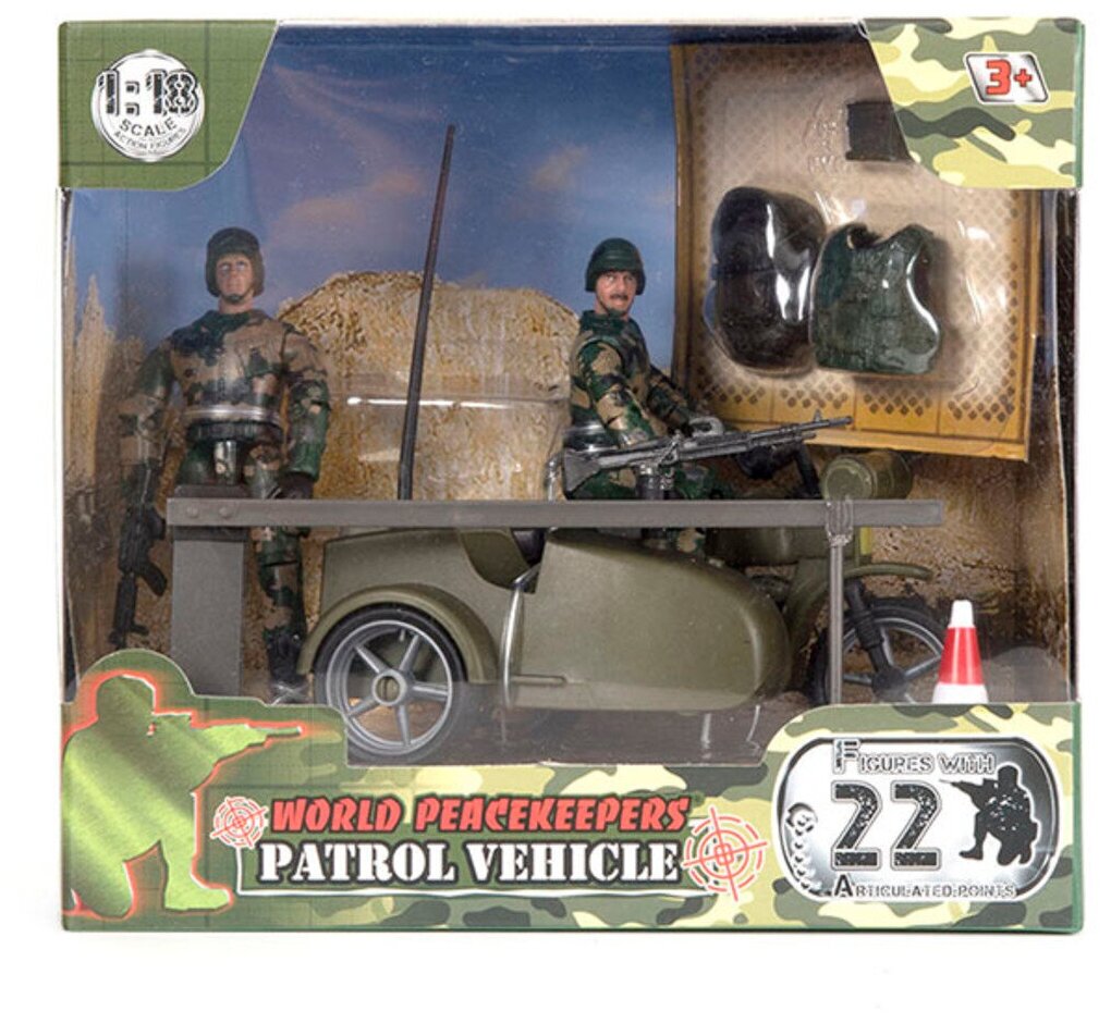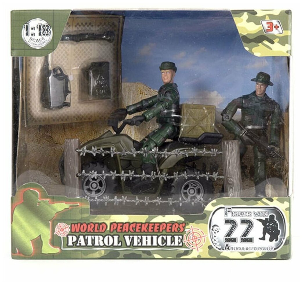 Патруль из 2 солдат с 22 точками артикуляции и высокой детализацией, фигурки выполнены в масштабе 1:18. Высота фигурки 9,53 см. В комплекте представлены военный транспорт с подвижными колесами, оружие, военные аксессуары, декоративные тематические элементы (перегородка с колючей проволокой или шлагбаум). В ассортименте 2 игровых набора.