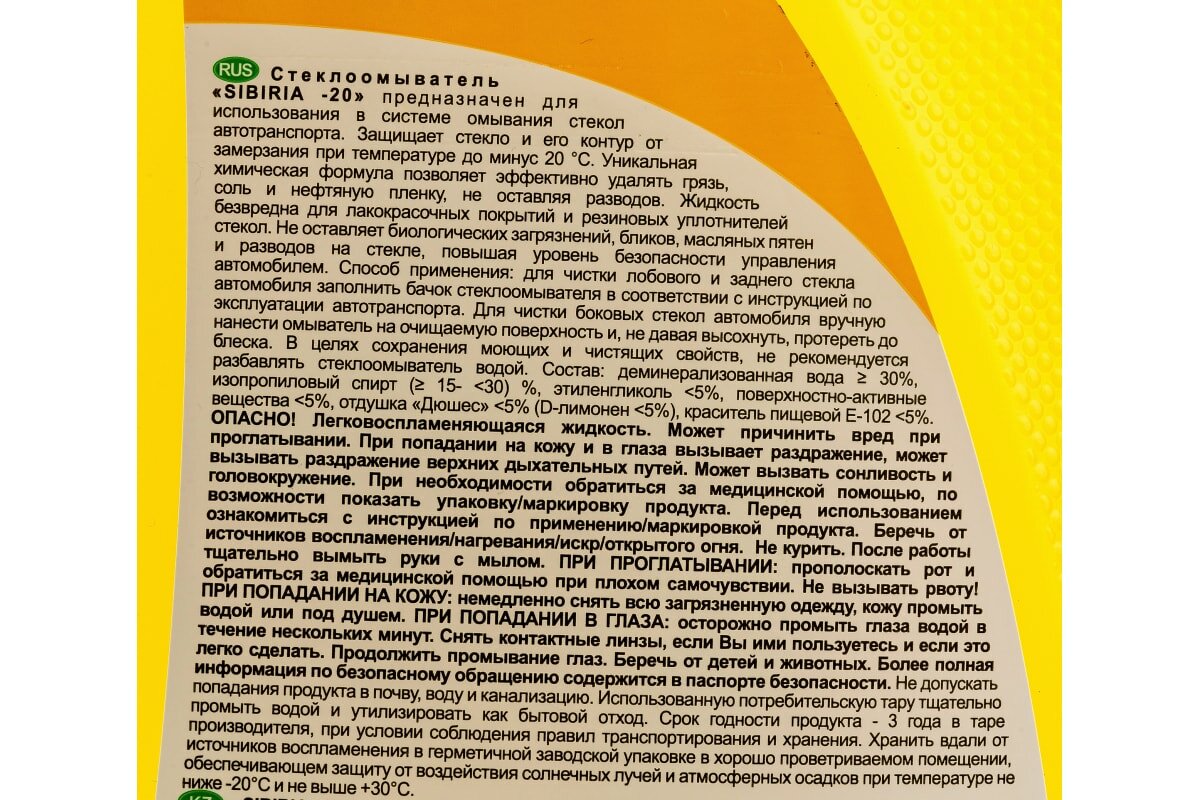 Стеклоомыватель Sibiria предназначен для предотвращения загрязнения и обледенения поверхности автомобиля. Уникальная химическая формула позволяет эффективно удалять грязь, соль и нефтяную пленку, не оставляя разводов. Стеклоомыватель безвреден для лакокрасочных покрытий и резинок стёкол. Не оставляет биологических загрязнений, бликов, масляных пятен и разводов на стекле, повышая уровень безопасности управления автомобилем.