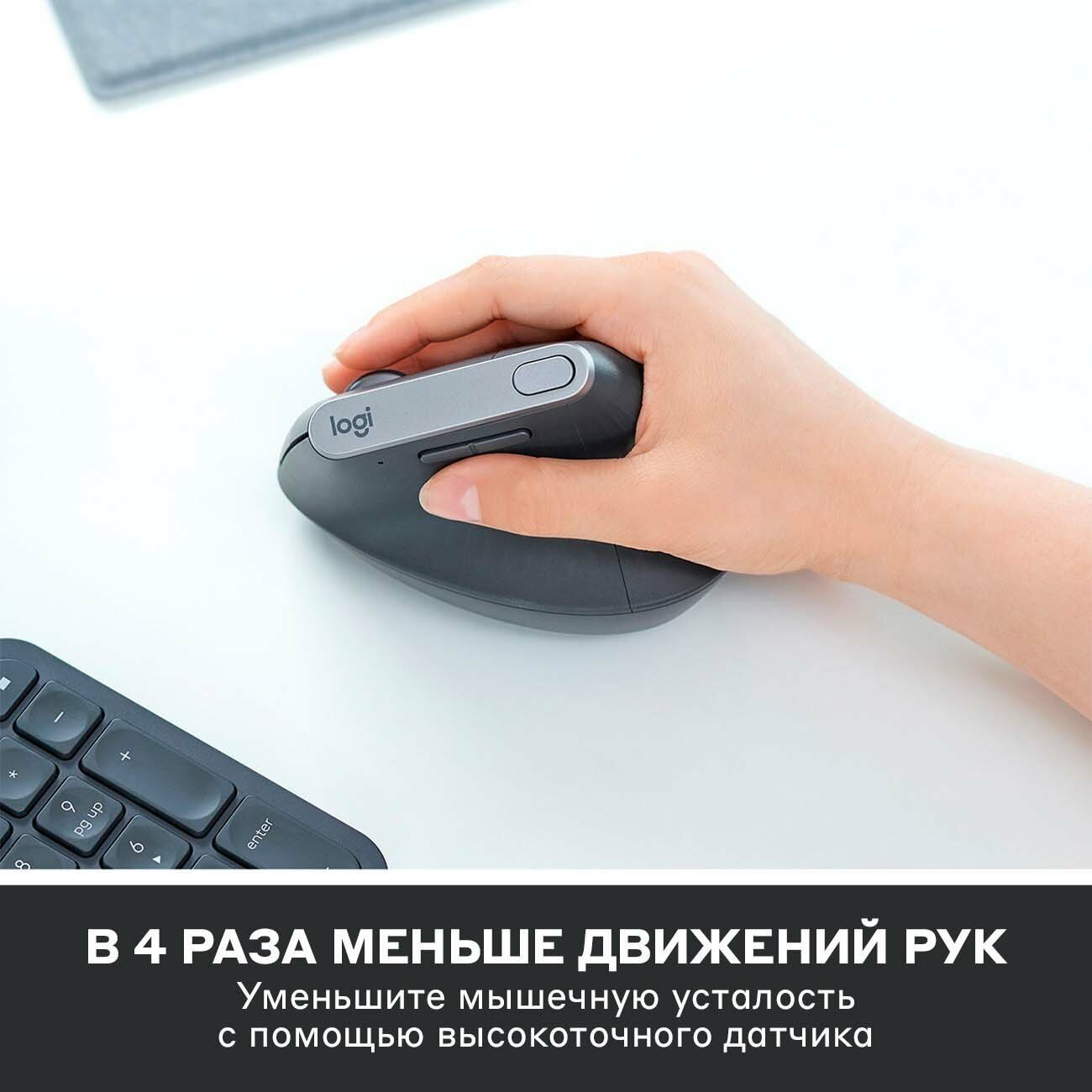 MX Vertical — это усовершенствованная мышь с эргономичной конструкцией, сочетающая в себе анатомически выверенный дизайн и высокую производительность, свойственную всем устройствам линейки Logitech MX. Разработчики мыши позаботились о том, чтобы снизить нагрузку на мышцы и давление на запястье пользователя, а также дать ему возможность поддерживать здоровую осанку. Естественное положение кисти — как при рукопожатии. При работе с мышью MX Vertical кисть находится в естественном положении, как при рукопожатии. Благодаря этому нагрузка на мышцы снижается на 10 % (по сравнению с обычной мышью горизонтальной конструкции), а пользователь может поддерживать здоровую осанку. Вертикальный угол 57° обеспечивает удобное размещение запястья. Вертикальный угол наклона корпуса мыши MX Vertical составляет 57°. Это решение позволило снизить давление на запястье, а также обеспечить удобное размещение большого пальца. Удобная форма и текстурированная поверхность. Мышь MX Vertical сконструирована с учетом анатомических особенностей кисти человека и покрыта приятным на ощупь материалом. Благодаря уникальной конструкции c текстурированной прорезиненной поверхностью она обеспечит удобный и надежный захват. Усовершенствованное колесико прокрутки. Высокоточное колесико прокрутки позволяет быстрее переходить к нужной информации и может использоваться в качестве центральной кнопки. Быстрая перезарядка. При полностью заряженной батарее мышь может проработать до четырех месяцев, а быстрой зарядки в течение одной минуты хватит на три часа работы. Для подзарядки устройства используйте кабель USB-C.