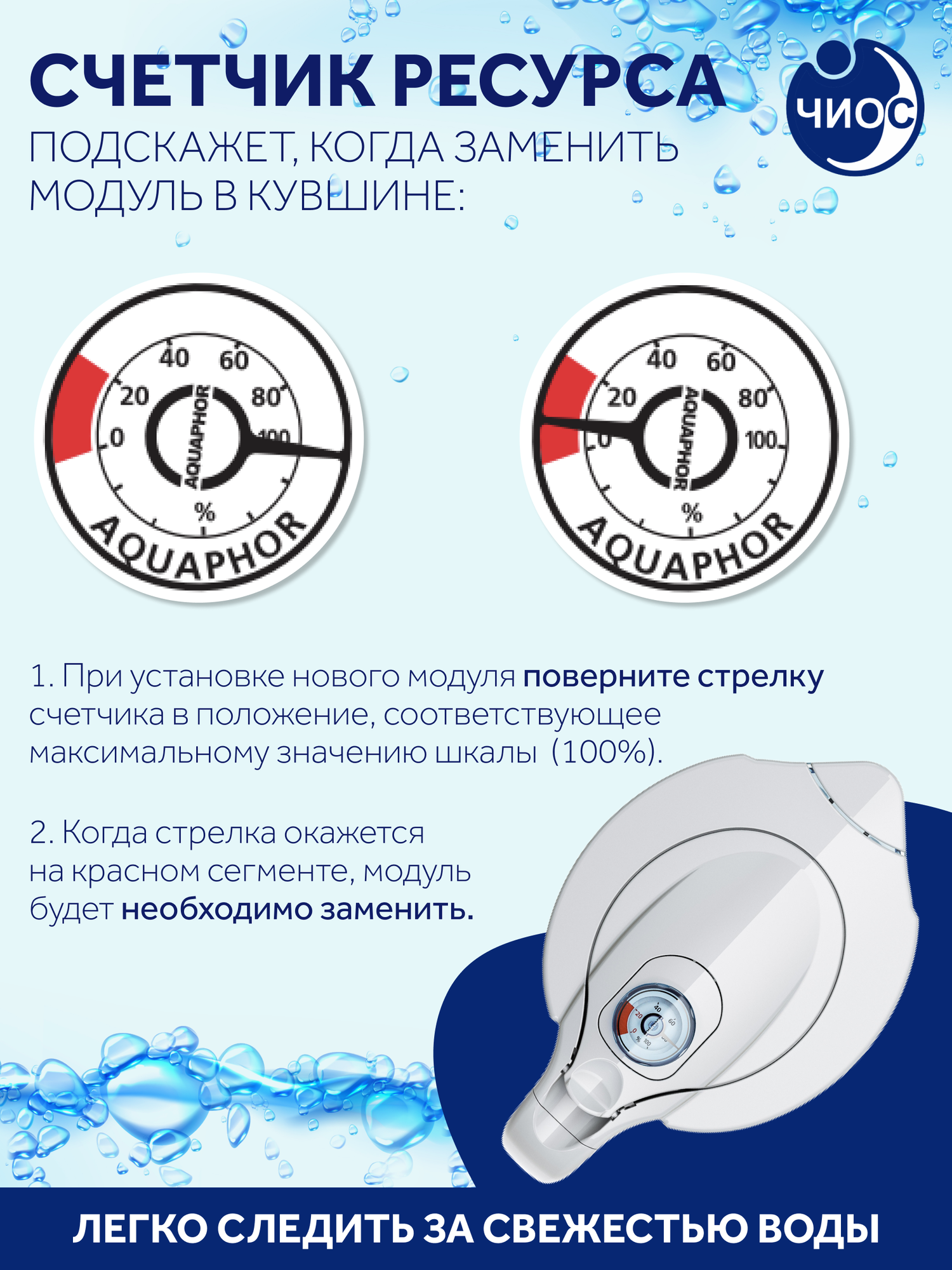 Особая конструкция сменного модуля АКВАФОР А5 увеличивает ресурс и позволяет дольше очищать воду от вредных примесей, посторонних привкусов и запахов, даже если она ржавая или мутная. Уже очищенная вода дополнительно обогащается солями магния. Отследить время замены поможет механический счетчик на крышке, который легко обнулить при замене фильтра.