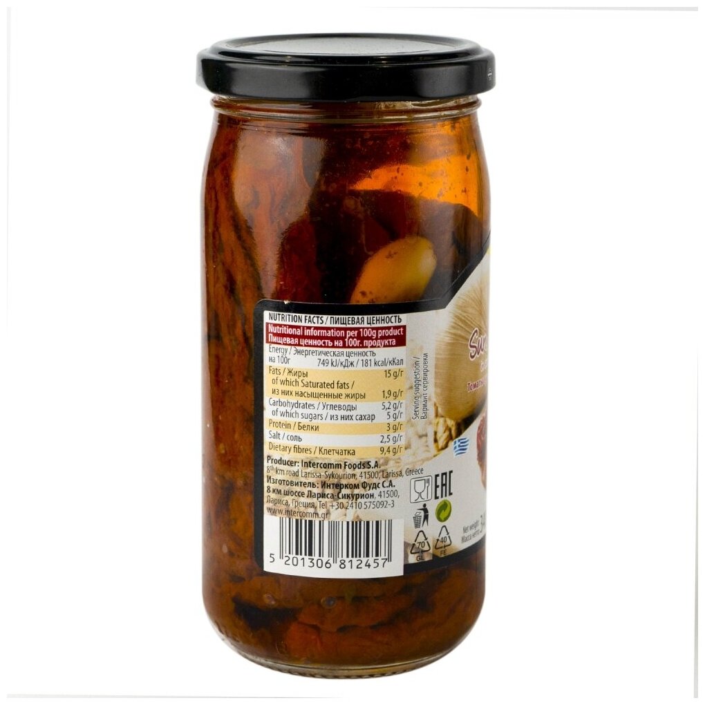 | Состав | сушеные томаты (55%), подсолнечное масло, морская соль, винный уксус, каперсы, чеснок, травы и специи, регулятор кислотности лимонная кислота. Могут содержаться фрагменты орехов |