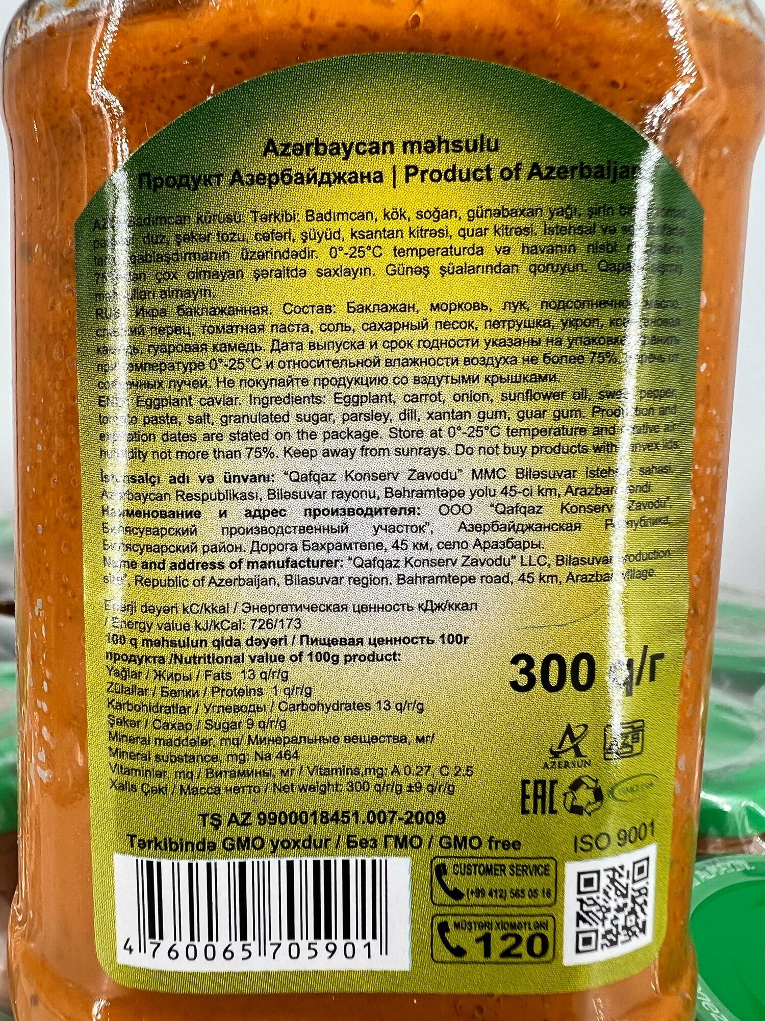 Состав | Баклажан, морковь, лук, подсолнечное масло, перец, томатная паста, соль, сахар, петрушка, укроп. |
