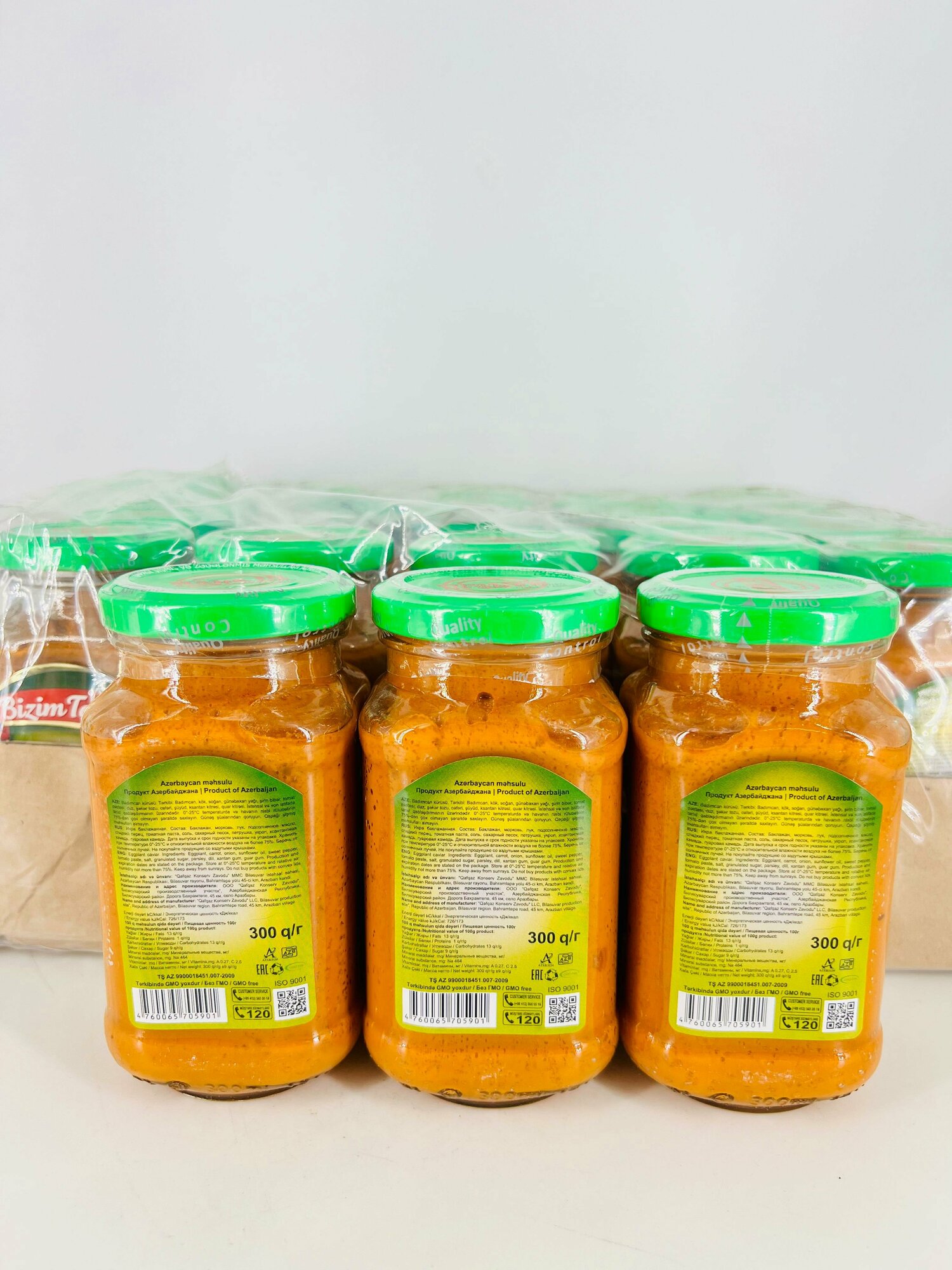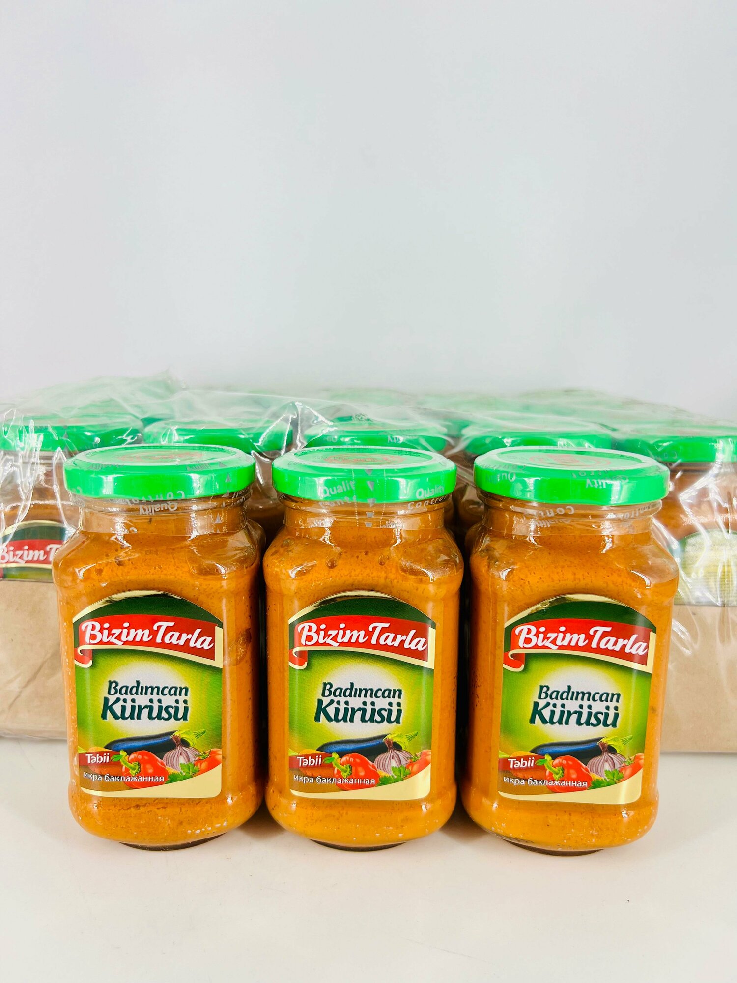 Икра Bizim Tarla из баклажанов с добавлением спелых томатов, красного перца и специй. Можно подать как самостоятельное блюдо или использовать с любимым гарниром. Подходит для быстрого перекуса.