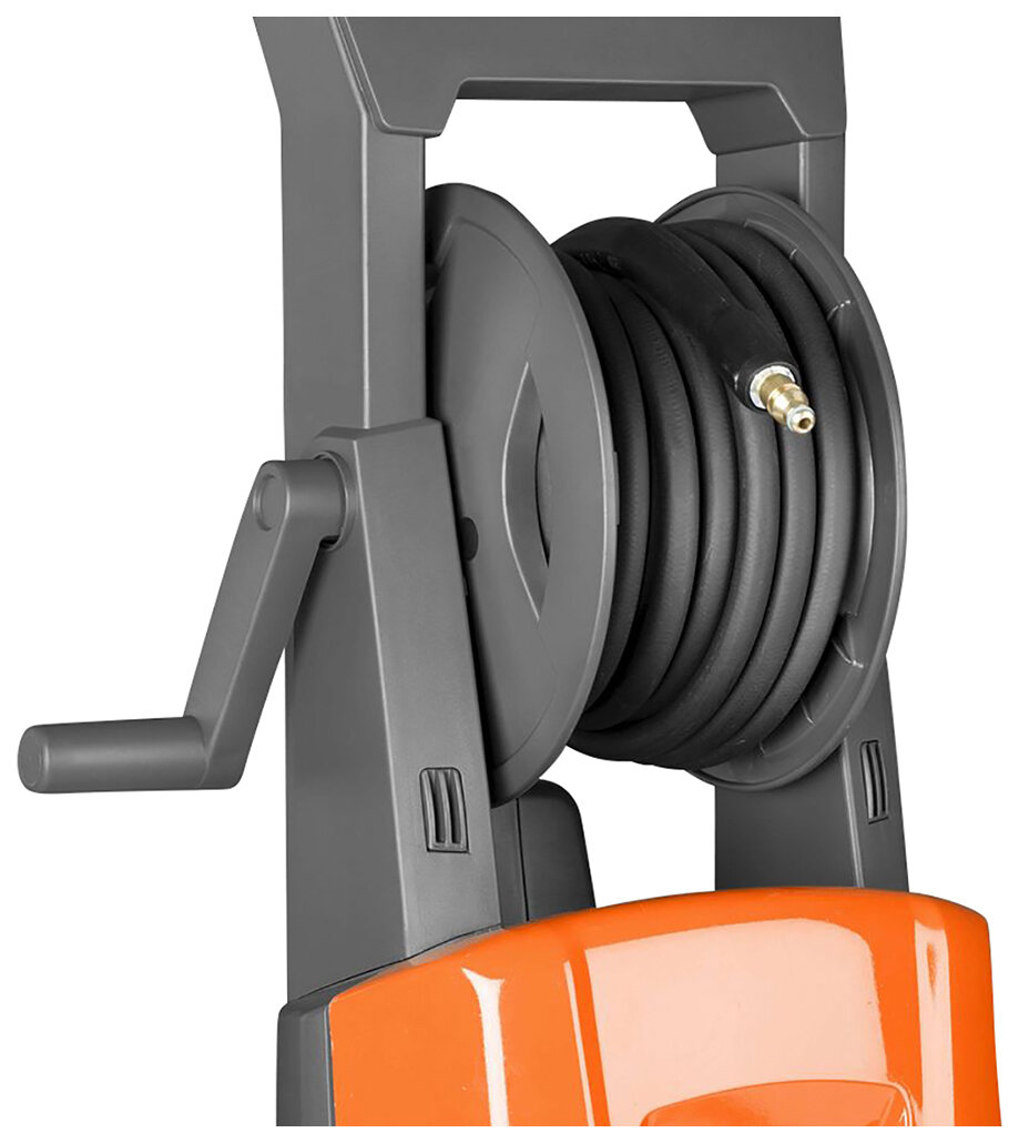 Шланг с текстильной оплёткой длиной 8 метров и катушкой для его хранения, форсунка «плоская струя», форсунка «ротор» и нерегулируемый пенный распылитель идут в комплекте.