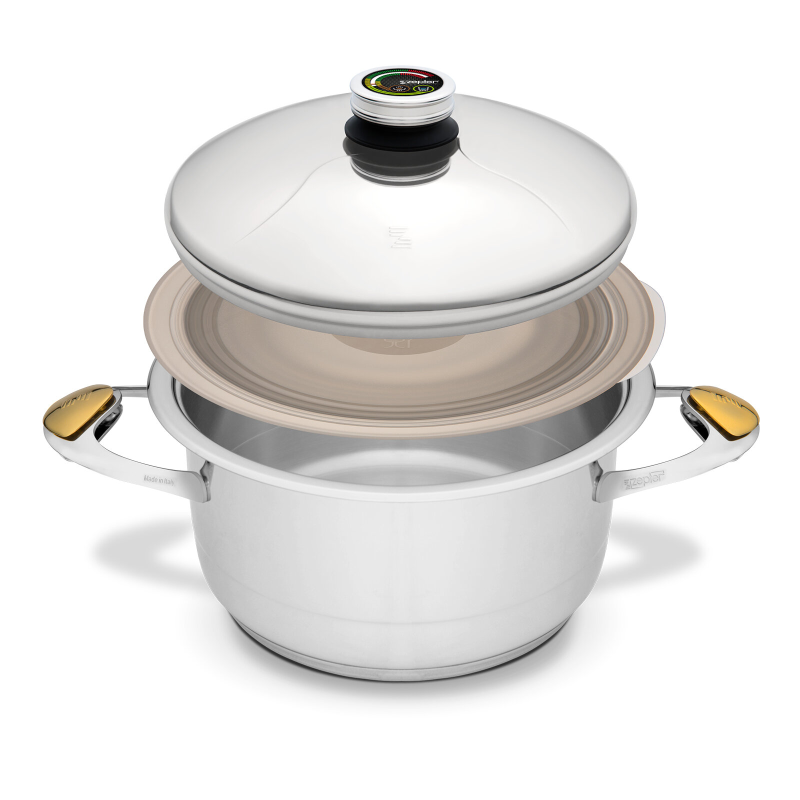 Кастрюля 5,5 л из нержавеющей стали, D24 см с крышкой подходит для приготовления классических рецептов, а также позволяет варить влагосодержащие продукты без добавления воды. Изготовлена из аустенитной нержавеющей стали 316L, которая особенно устойчива к коррозии, высоким температурам и агрессивным средам, что позволяет посуде прослужить долгие годы даже при постоянной эксплуатации.Трехслойное термоаккумулирующее дно равномерно разогревается и долго сохраняет температуру, позволяя экономить газ и электроэнергию. Такое дно позволяет использовать кастрюлю на всех типах плит, включая индукционные.На крышке находится термоконтроллер, благодаря которому контролировать процесс готовки можно не поднимая крышки.Когда стрелка находится в середине зеленой зоны, температура является оптимальной для приготовления здоровой пищи. С радиоцифровым термоконтроллером нужная температура и время приготовления устанавливаются за считанные секунды, простым нажатием кнопки. После того как все установлено, процесс приготовления запускается и заканчивается автоматически. Удобный циферблат позволяет легко следить за приготовлением по температурной шкале: влажного или сухого режимов.Цветные поля указывают на три диапазона температур: желтое поле для предварительного нагрева, зеленое - для правильной температуры приготовления, а красное означает перегрев.Крышку можно использовать в качестве подставки под горячую кастрюлю. В процессе готовки, если вам необходимо перемешать блюдо, закрепите крышку на ручке.Форма бортиков обеспечивает водяной затвор с крышкой, позволяя обеспечить замкнутый цикл приготовления пищи. Также они удобны для переливания жидкости из кастрюли даже в узкие емкости.Ручки не нагреваются при приготовлении на плите, с ними кастрюлю можно ставить в духовку.При мытье в посудомоечной машине с крышки нужно открутить термоконтроллер.Гарантия на металл составляет 30 лет.Перед первым использованием кастрюлю нужно расконсервировать – удалить остатки шлифовочной пасты, в которой хранится новый товар. Для этого рекомендуется использовать моющее средство от Zepter TFD-942. Промойте кастрюлю и крышку горячей водой, с помощью губки нанесите чистящее средство снаружи и внутри, оставьте на 10-15 минут, тщательно смойте и повторите процедуру 2-3 раза. Это позволит вам сохранить её блестящий вид надолго.В повседневной эксплуатации можно использовать обычные средства для мытья посуды, но для придания дополнительного блеска рекомендуется также использовать чистящее средство от Zepter TFD-942.