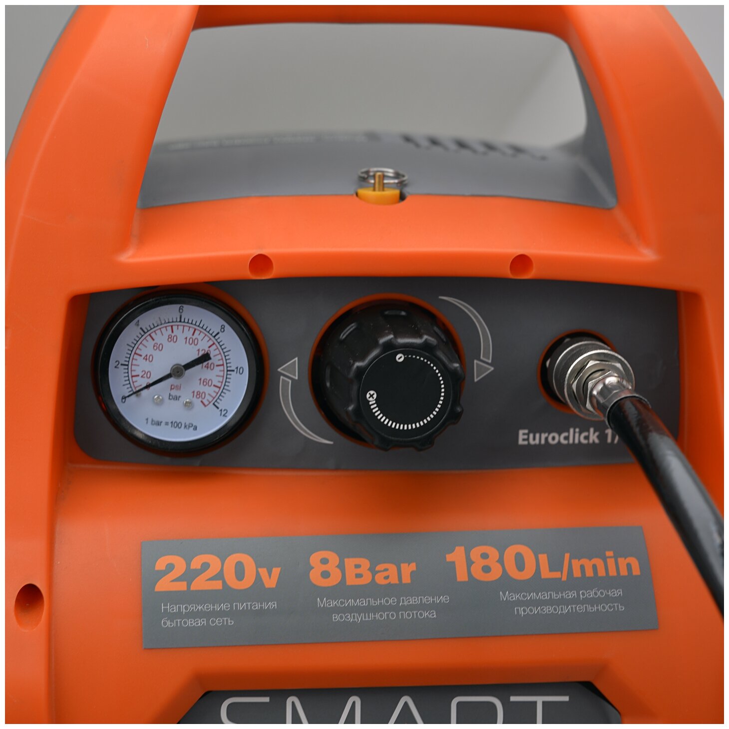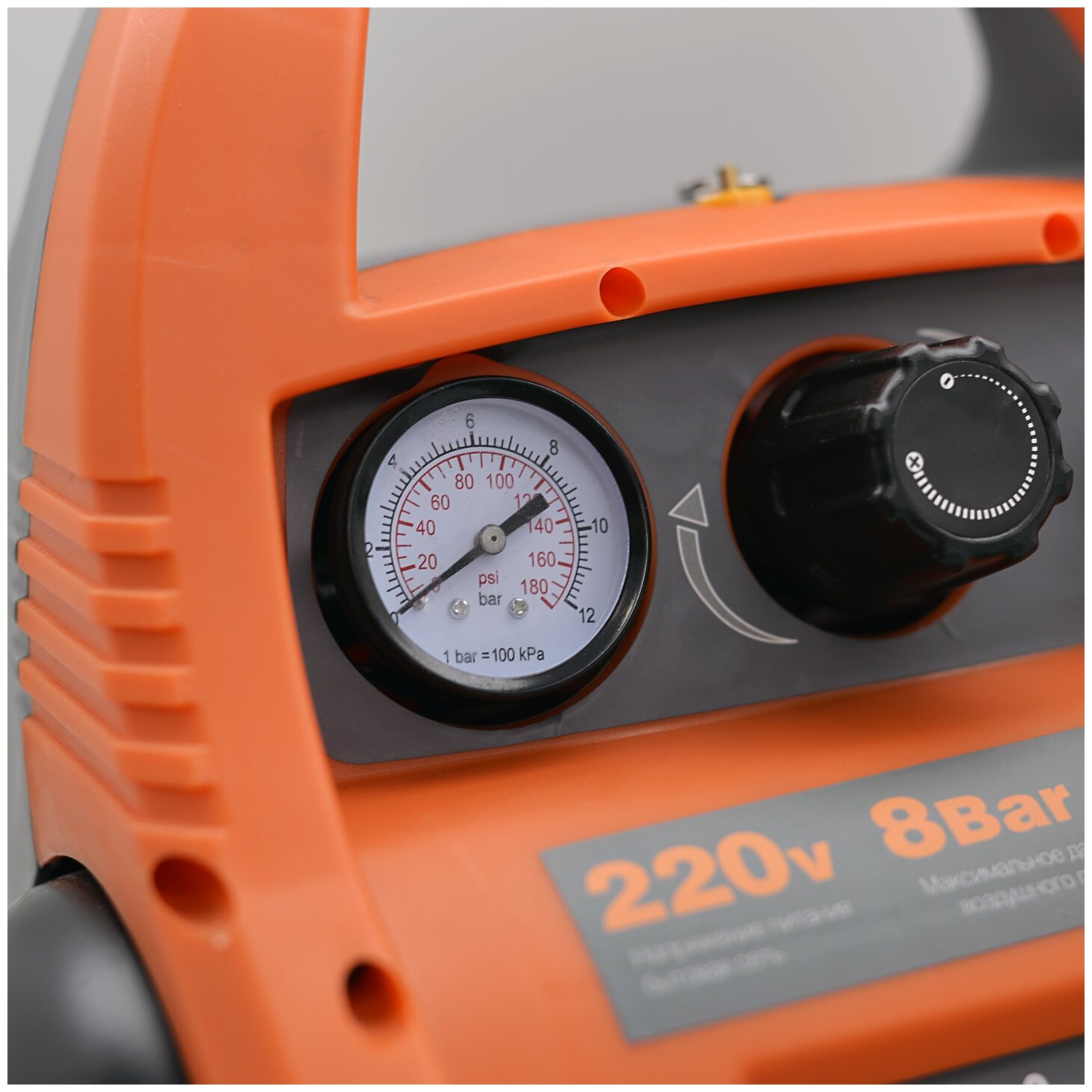 Компрессор питается от сети в 220 В, к которой его подключают с помощью шнура длиной в 1.4 м. Точный манометр с шагом деления шкалы 0.1, 2, расположенный прямо на пневмопистолете, поможет быстро накачать шины автомобиля даже тому, кто с этим впервые сталкивается. Компрессор функционирует в широком диапазоне температур (от 5 °С до 40 °С), что позволяет его использовать при любой погоде.