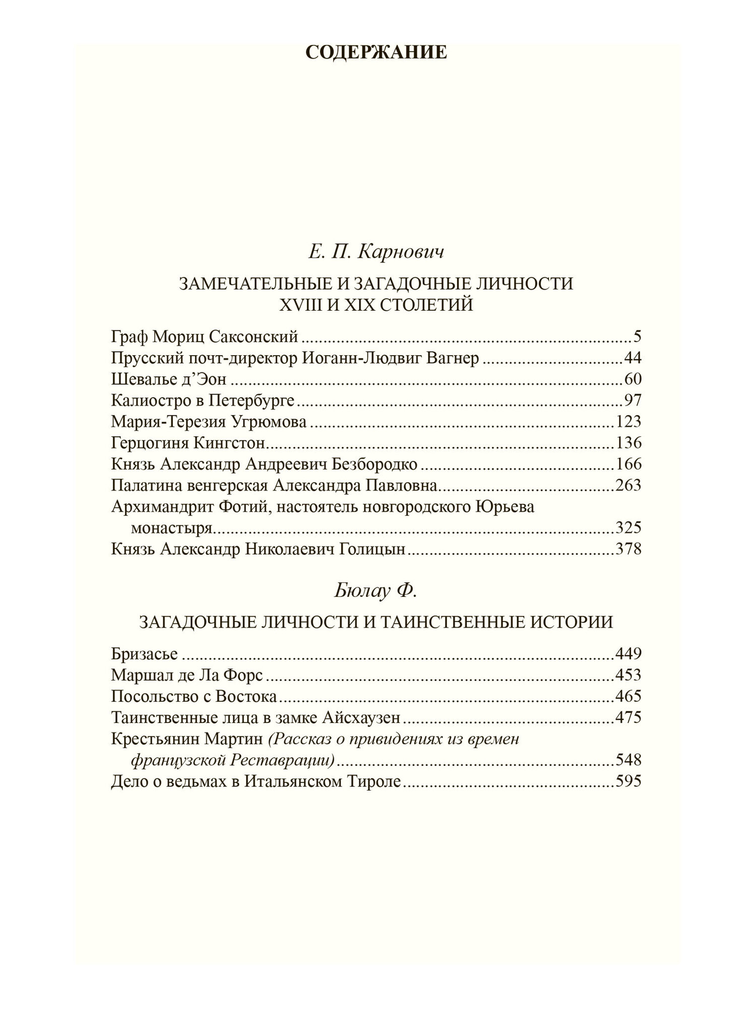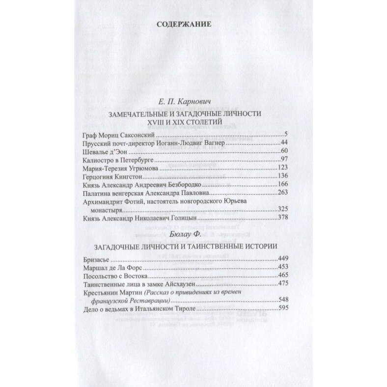.Фридрих Бюлау - преподаватель права, профессор практической философии и политики Лейпцигского университета, выпустил множество научных книг, а под конец жизни увлекся делами давно минувших дней. Он тщательно собирал материалы по истории Европы, результатом его работы стал обстоятельный труд "Загадочные личности и таинственные истории". Он пишет и об авантюристе Бризасье, пытавшемся провернуть аферу и выдать себя за сына французского короля, и о герцоге де Ла Форсе, маршале Франции, который во время Варфоломеевской ночи потерял отца и старшего брата, сам же спасся, притворившись убитым. Он подробно анализирует уголовное дело о ведьмах в итальянском Тироле XVII века, разбирая показания подсудимых, аргументы защиты и доказательства обвинения. Его герои - главный маршал Франции Морис Саксонский, тайный агент шевалье д'Еон, появившийся при русском дворе в юбке, прусский шпион, почт-директор Иоганн Вагнер, авантюристка и искательница приключений герцогиня Елизавета Кингстон, защитник православия и непримиримый борец с масонами архимандрит Фотий и его могущественный противник, масон, обер-прокурор Святейшего Синода князь Александр Николаевич Голицын. Карнович позволяет взглянуть на историю России с неожиданной стороны...