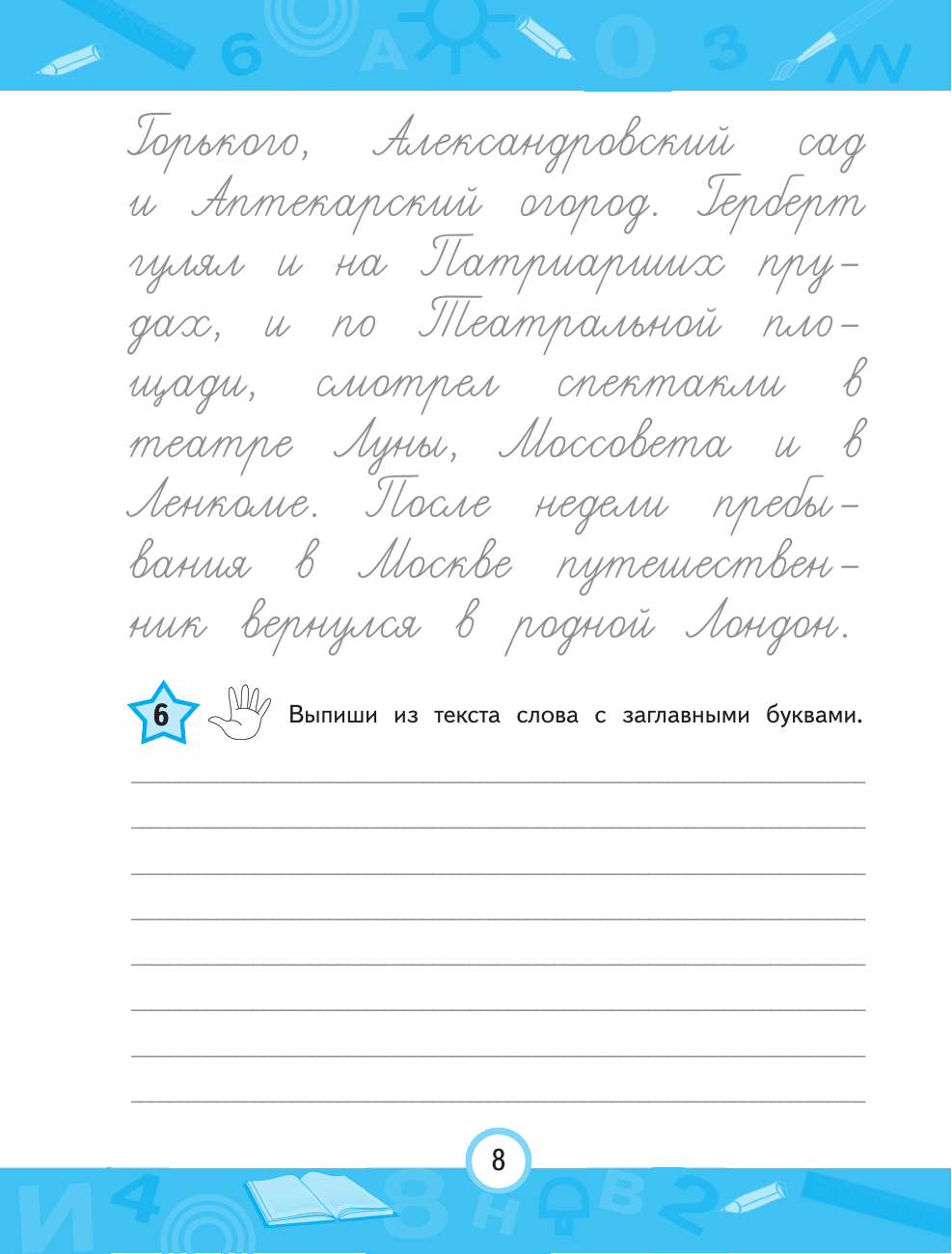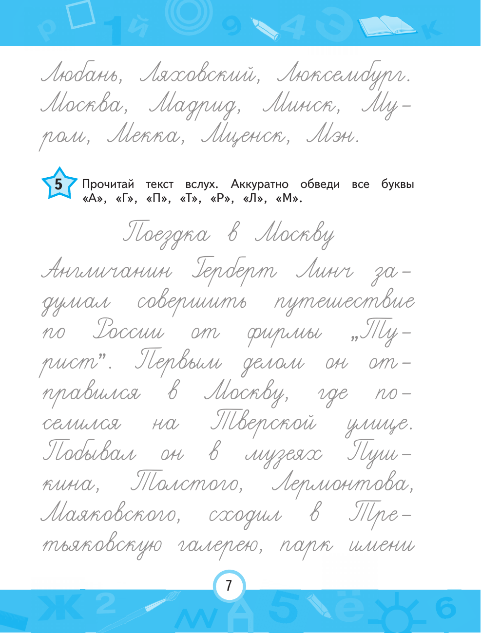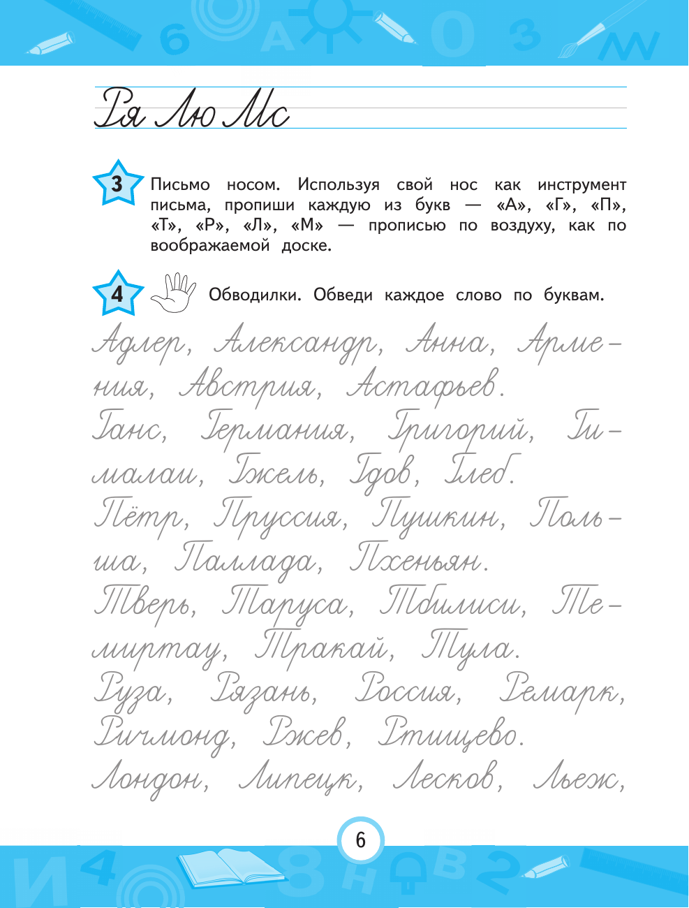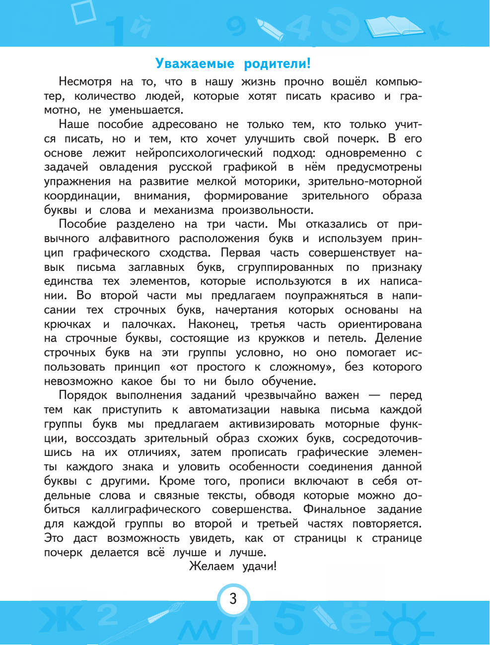 В основе книги лежит нейропсихологический подход: одновременно с задачей овладения русской графикой предусмотрены и упражнения на развитие мелкой моторики, внимания, зрительного образа буквы и слова.