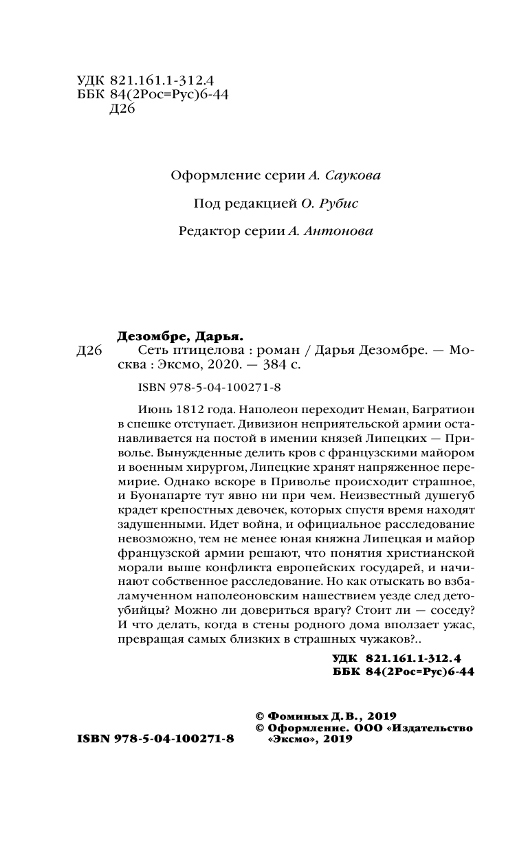 Книга: Сеть птицелова (Дарья Дезомбре); Эксмо, Редакция 1, 2019