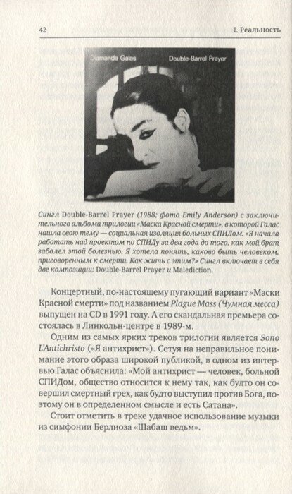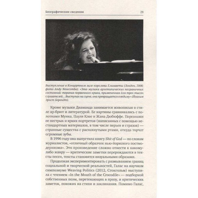В свое время, в девяностые годы, увлекаясь творчеством группы "Yello", на альбоме 1997г. "Pocket Universe" впервые услышал звуки, издаваемые Д.Галас. Тогда это трудно было вычленить и облачить в некую форму понимания, поэтому был куплен МР3 диск со всеми ее альбомами на тот период. Послушать его, вернее выдержать, эти вопли крики, вытье, визг и т.п. я тогда не смог, не могу и сейчас. Но , как истинный любитель музыки, при появлении монографии не смог пройти мимо, дабы изучив, по возможности понять значимость и глубину линости и творчества артистки. Данная книга дает волне исчерпывающую информацию о жизни и деятельности Галас, а также краткий, но емкий разбор альбомов и синглов певицы. Исследование весьма уникальное, и возможно лучшего не появится. Поэтому настоятельно рекомендую приобрести всем, кто более менее серьезно интересуется современной музыкой, ибо книга в ближайшее время станет библиографической редкостью.