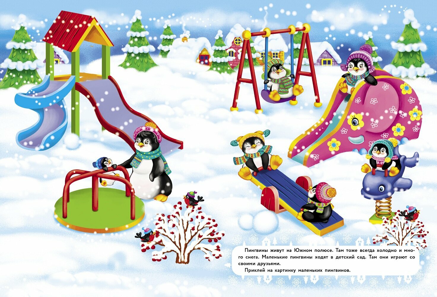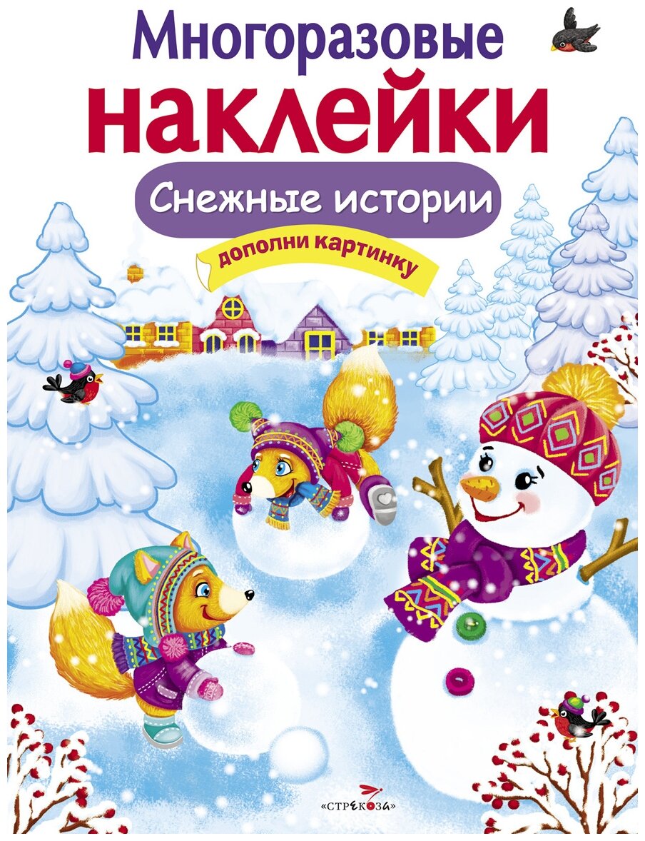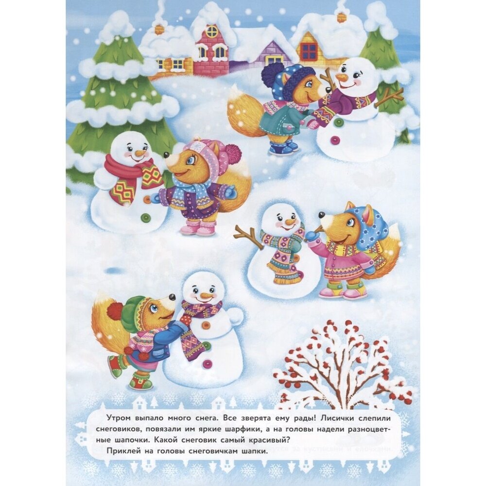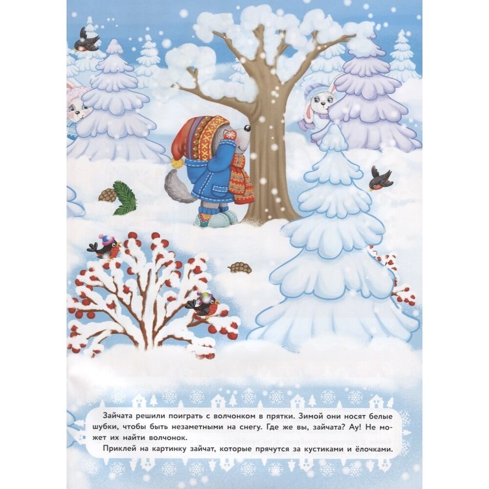 Наступила зима, и теперь вокруг так много снега! Можно играть в снежки, кататься с горки и лепить снеговика - столько весёлых занятий! Давай играть вместе со зверятами и приклеивать яркие многоразовые наклейки.