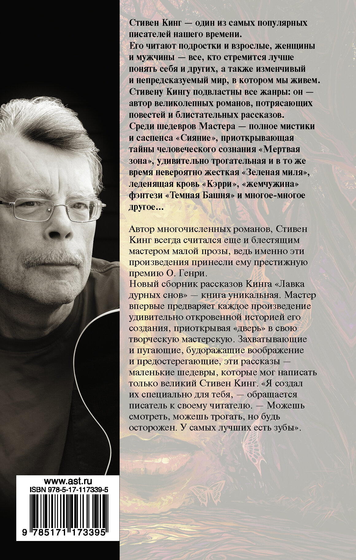 Автор многочисленных романов, Стивен Кинг всегда считался еще и блестящим мастером малой прозы, ведь именно эти произведения принесли ему престижную премию О. Генри. . Новый сборник рассказов Кинга Лавка дурных снов" - книга уникальная. Мастер впервые предваряет каждое произведение удивительно откровенной историей его создания, приоткрывая "дверь" в свою творческую мастерскую. Захватывающие и пугающие, будоражащие воображение и предостерегающие, эти рассказы - маленькие шедевры, которые мог написать только великий Стивен Кинг. "Я создал их специально для тебя, - обращается писатель к своему читателю. - Можешь смотреть, можешь трогать, но будь осторожен. У самых лучших есть зубы."