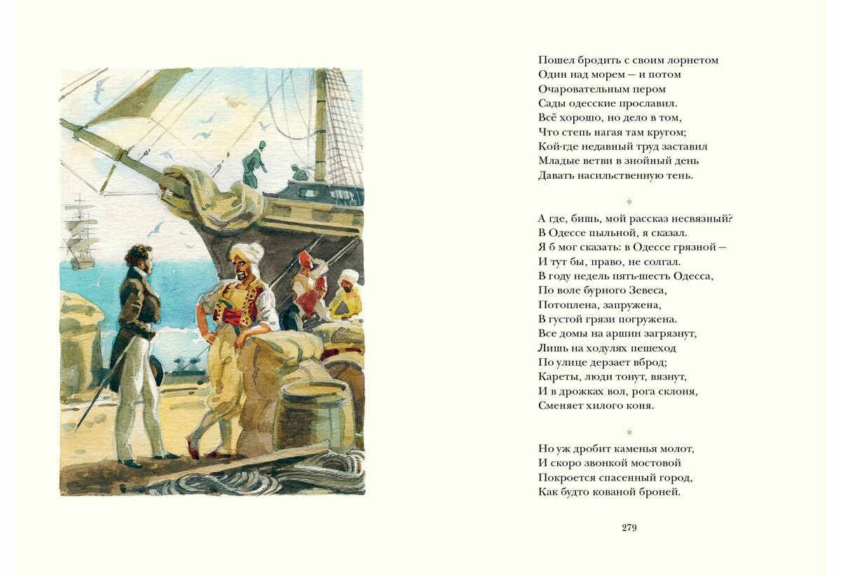 Очень красивое издание отличного качества. Красота классическая: спокойная, акварельная, достойная великого произведения. Самое яркое в книге - обложка и ляссе. Иллюстраций много, они мягко и ненавязчиво сопровождают текст, оставляя простор для фантазии читателя. Примерно четверть книги занимают комментарии и словари, что очень ценно. Привычный шрифт, встречающийся в других книгах Нигмы, на мой вкус, немного детский. Но и на издании указано « для детей среднего школьного возраста». Вывод. Не рискну назвать книгу роскошной или идеальной, но с удовольствием поселила её в своей библиотеке по соседству с недавно вышедшей «Лирикой». Пусть подрастающее поколение знакомится с классикой в таком исполнении. И сравнивает с другими изданиями. И Вы сравните. Пятая глава почти полностью.