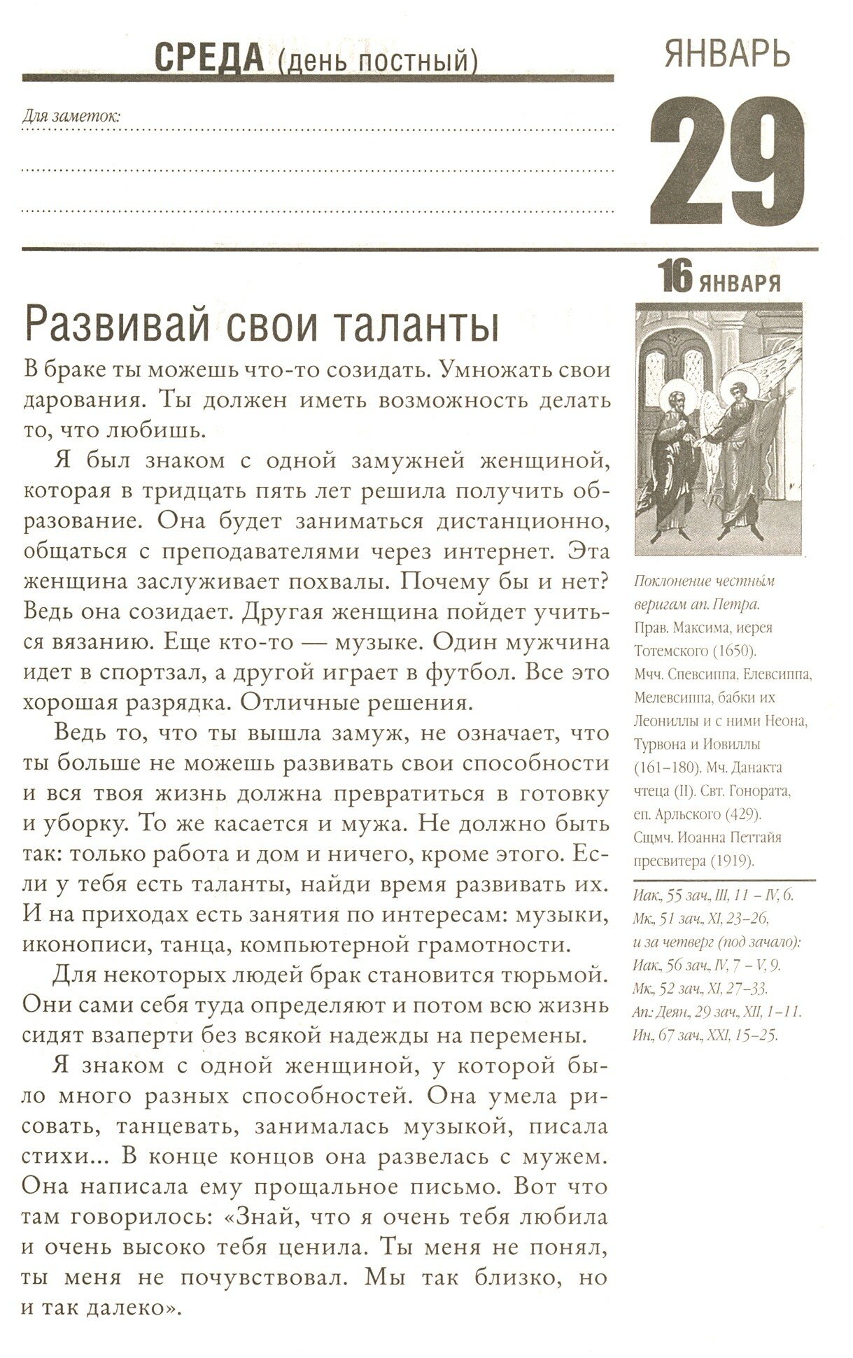 Отличный календарь, содержит выдержки из книг архимандрита Андрея (Конаноса). Кто не читал его книг, настоятельно рекомендую почитать. Это жемчужина в море православной литературы. На каждый день, даётся выдержка на определённую тему, очень хорошо начинать день, задумываясь над этими простыми истинами.