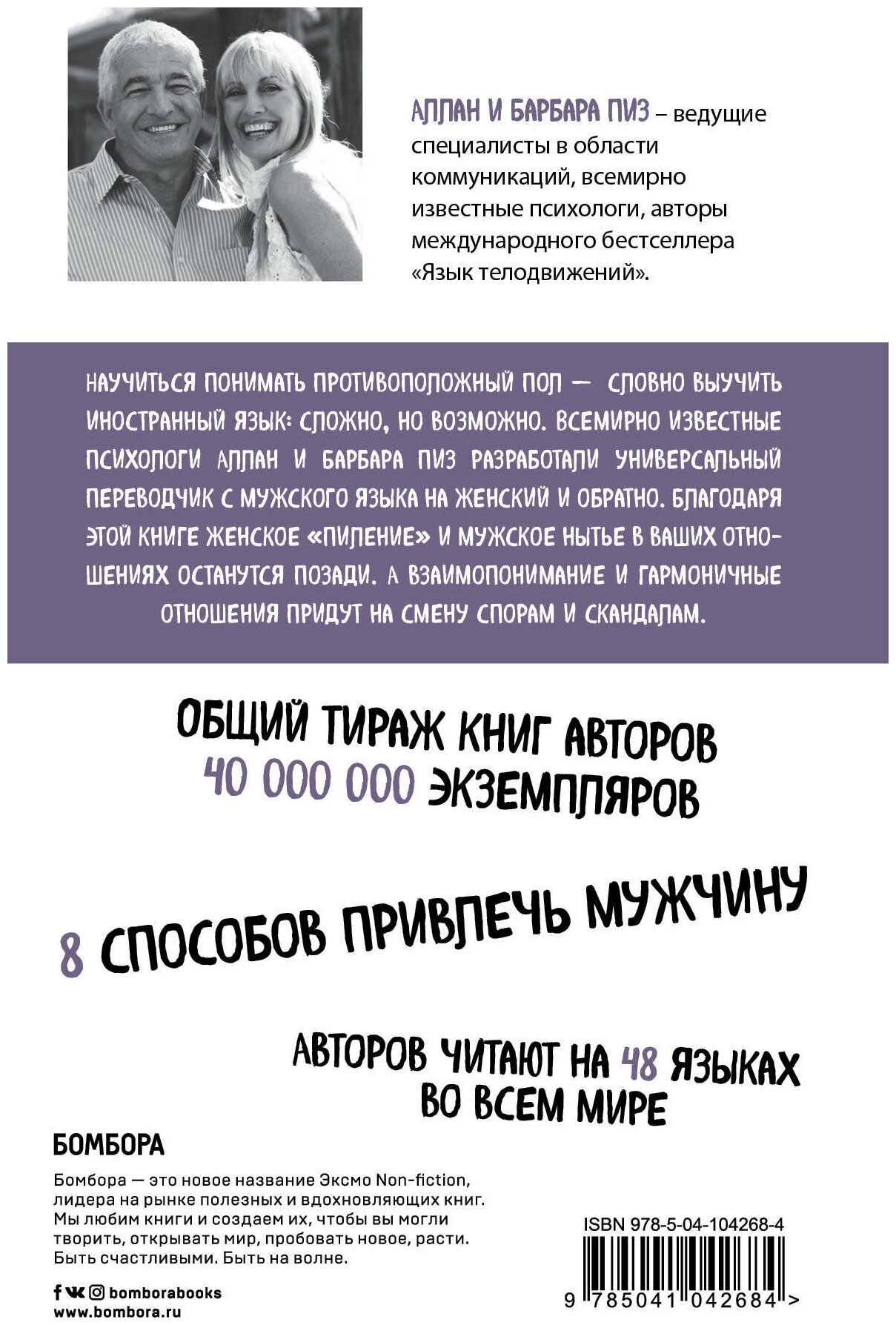 Об авторах Аллан и Барбара Пиз – ведущие специалисты в области коммуникаций, всемирно известные психологи, авторы международного бестселлера «Язык телодвижений», переведенного на 48 языков мира, общий тираж которого превышает 4 000 000 экземпляров. Цитата: «Чтобы добиться успеха в отношениях с противоположным полом, вы должны уметь разговаривать на двух языках – на мужском и женском». Почему эта книга бестселлер В мире где гендерные роли так явно размыты и трансформированы, авторы блестяще сумели сформулировать различия в восприятии реальности мужчинами и женщинами, и объяснить мотивы «типичных» поступков. Для кого эта книга Для тех, кто хочет разобраться в особенностях женской и мужской психологии, наладить отношения в семье и на работе. Кто хочет всегда добиваться своего, избегая ссор и конфликтов. Фишки Книга написана доступным увлекательным языком. Множество практических советов и полезных рекомендаций. Авторы разбирают реальные ситуации, с которыми современный человек сталкивается постоянно.