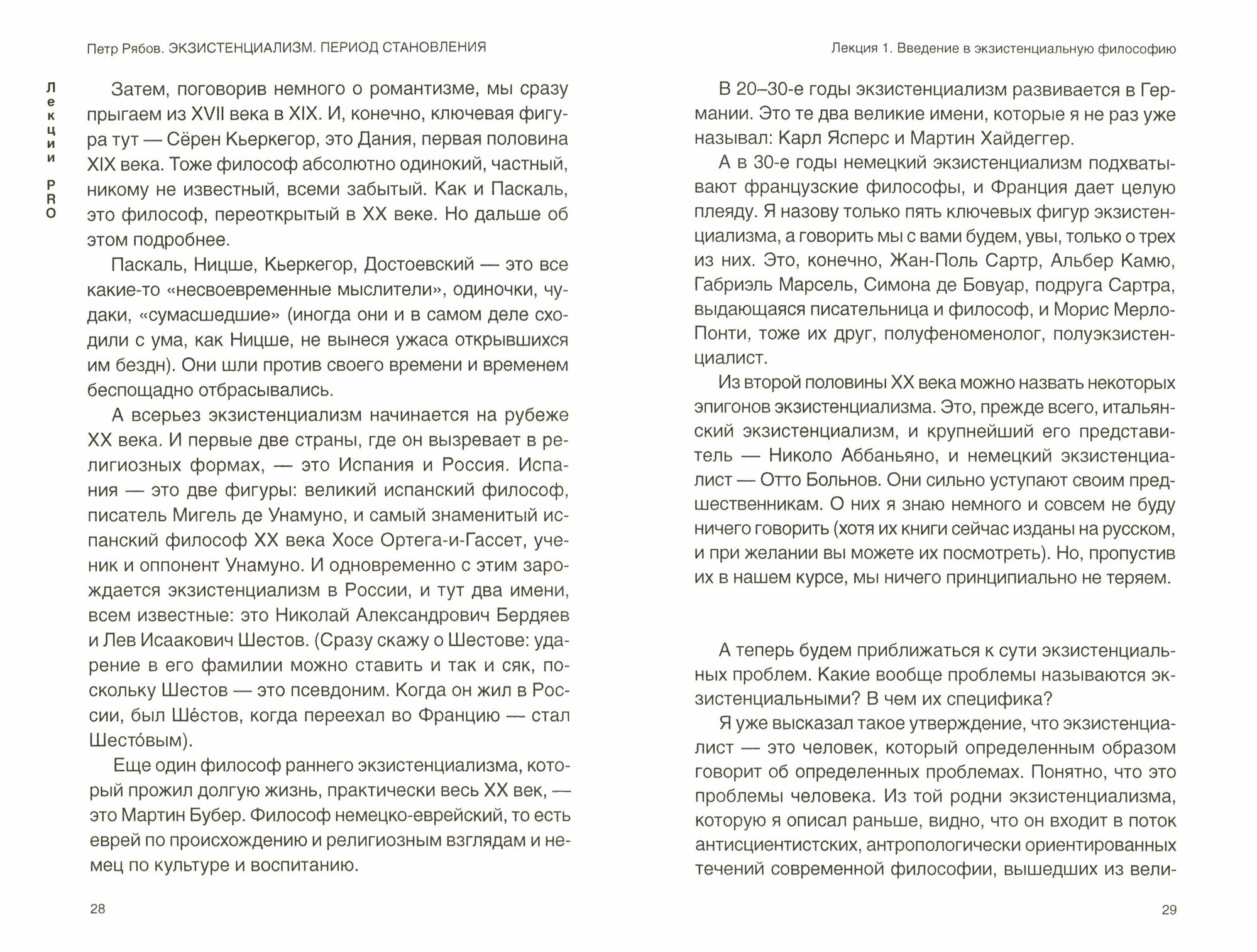 Этот объёмный том, содержащий лекции Петра Рябова, воодушевил и очень обрадовал меня. Как-то я попыталась прочесть книжку о философии Кьеркегора, который мне очень нравится - книжка была на русском, но я не поняла ничего и немного приуныла. Книга "Экзистенциализм. Период становления" написана удивительно доступно и живо. У автора настоящий дар говорить о сложных вещах простым языком. Чтение этой книги не только понятно, но и увлекательно. Важнейшие мысли выделены жирным шрифтом для их акцентирования, в конце некоторых лекций приведены вопросы слушателей и ответы лектора. Стиль лекций - живая речь живого человека, а не сухой учебник с чередой параграфов. Впечатление такое, что присутствуешь на лекции настоящего мастера и знатока своего дела. Очень довольна покупкой, приобрела сразу два тома.