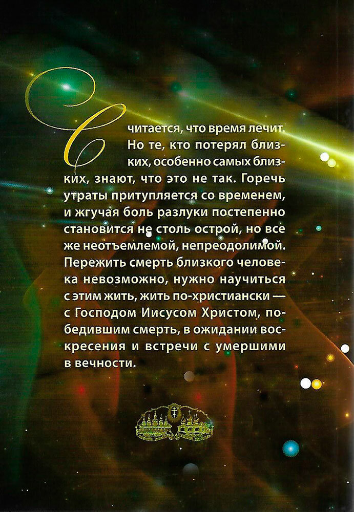 Предлагаемое издание утешит, даст силы перенести утрату, углубит знания о церковной жизни, а главное - поможет обрести горячую веру и сердцем взывать: "Соедини, Господи, умершия и живыя в нескончаемой радости" (из Акафиста о упокоении усопших).