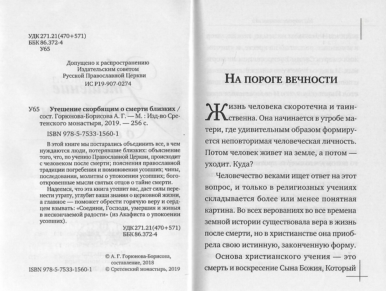 В книге "Утешение скорбящим о смерти близких", подготовленной Анастасией Горюновой-Борисовой, объединено все, в чем нуждаются люди, потерявшие близких: объяснение того, что, по учению Православной Церкви, происходит с человеком после смерти; пояснения православной традиции погребения и поминовения усопших; чины, последования, молитвы о упокоении; богооткровенные мысли святых отцов и подвижников благочестия о тайне смерти.