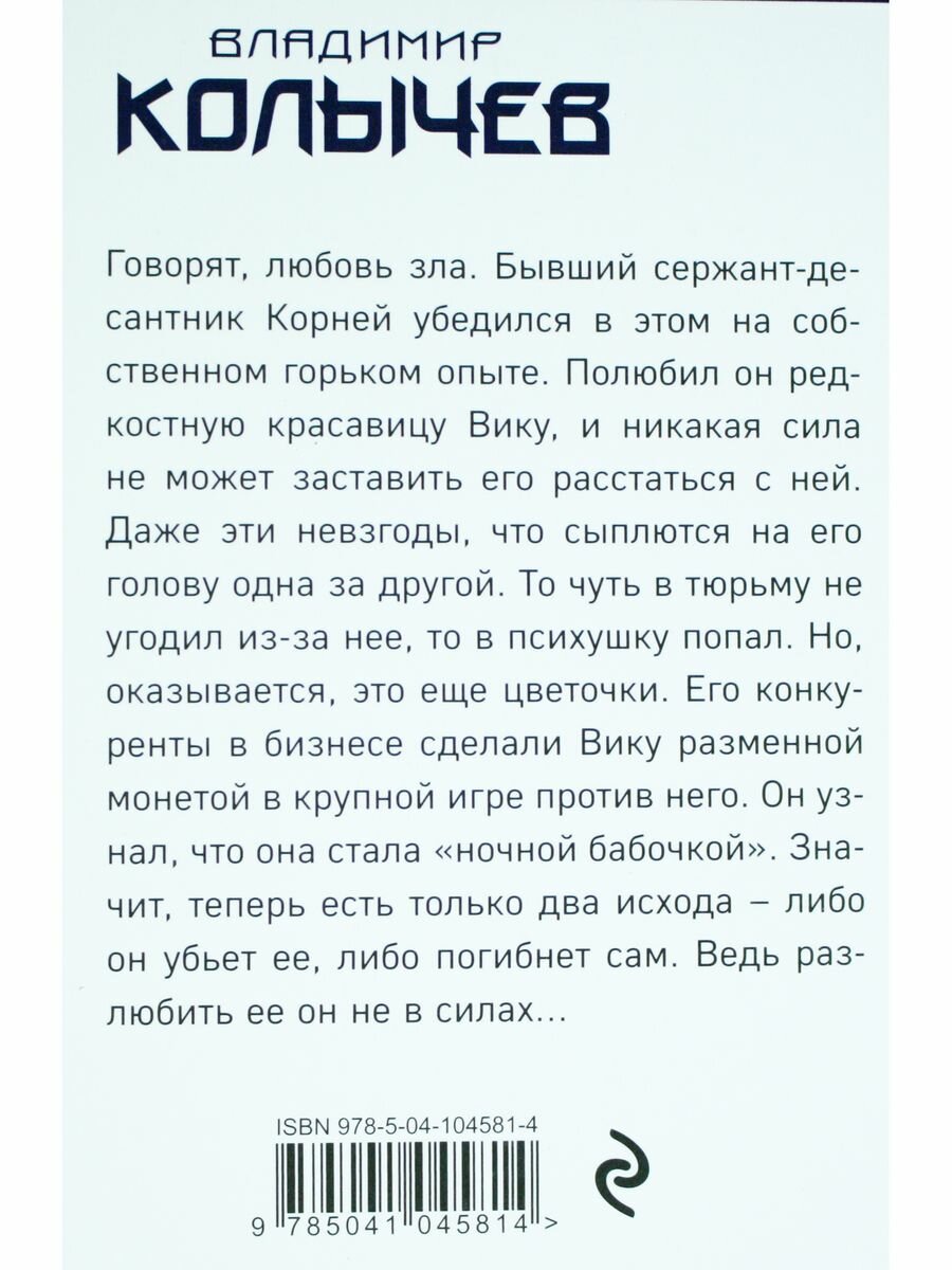 Говорят, любовь зла. Бывший сержант-десантник Корней убедился в этом на собственном горьком опыте. Полюбил он редкостную красавицу Вику, и никакая сила не может заставить его расстаться с ней. Даже эти невзгоды, что сыплются на его голову одна за другой. То чуть в тюрьму не угодил из-за нее, то в психушку попал. Но оказывается, это еще цветочки. Его конкуренты в бизнесе сделали Вику разменной монетой в крупной игре против него. Он узнал, что она стала "ночной бабочкой". Значит, теперь есть только два исхода - либо он убьет ее, либо погибнет сам. Ведь разлюбить ее он не в силах…