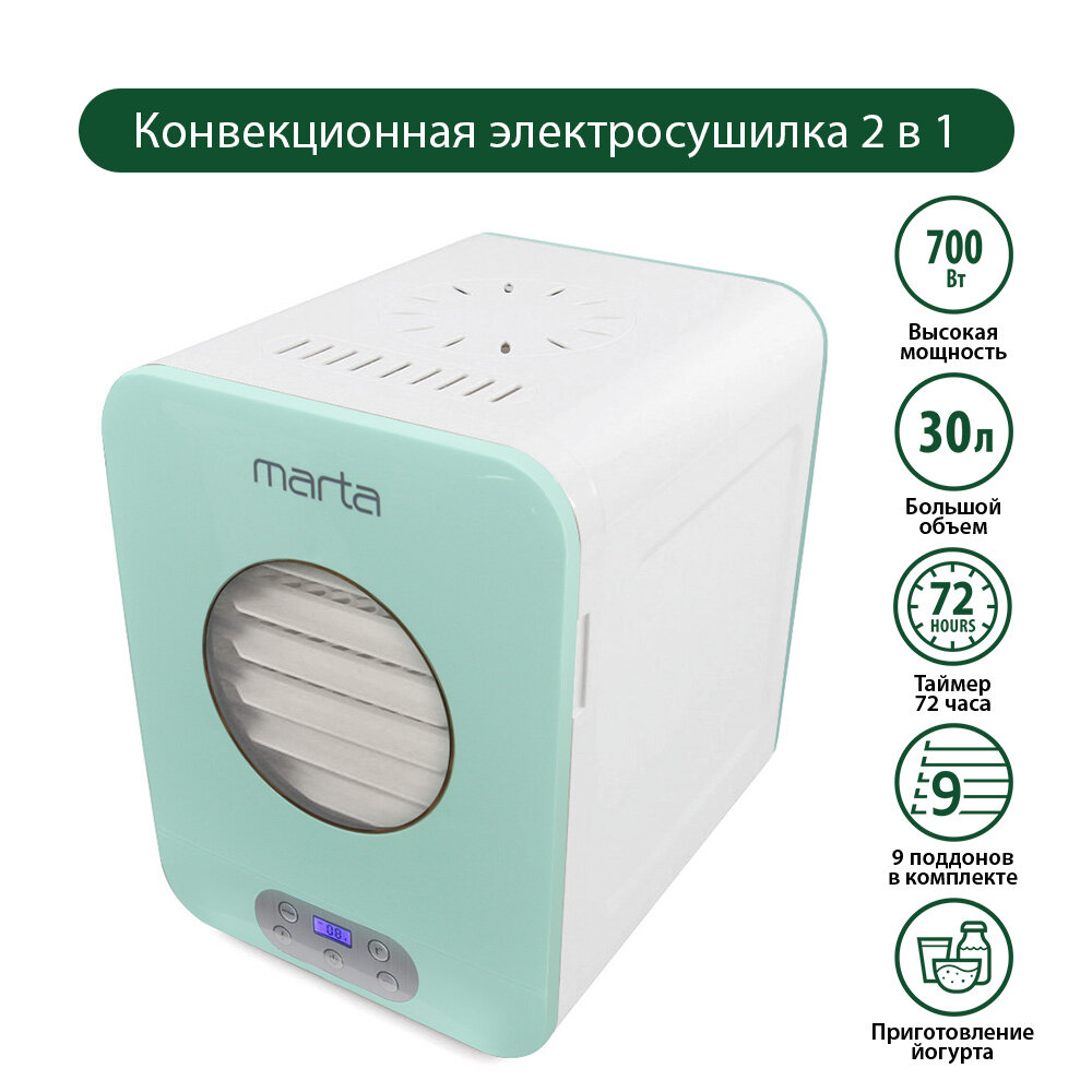 Электрическая сушка Marta MT-1956 предназначена для создания домашних заготовок из фруктов, овощей, трав, зелени и другого сырья. Она изготовлена из пластика, который при нагревании не выделяет запахов и хорошо сохраняет как вкус, так и полезные вещества, содержащиеся в продуктах.многоярусная конструкцияУстройство оснащено девятью поддонами. Благодаря этому вы легко разместите в небольшом объёме значительное количество продуктов. ВСЁ под контролемВ этой модели реализована электронная система управления. Она автоматически следит за заданными параметрами и при необходимости корректирует их, а таймер позволяет настроить время работы на срок до 72 часов. Важная информация отображается на LED-дисплее.