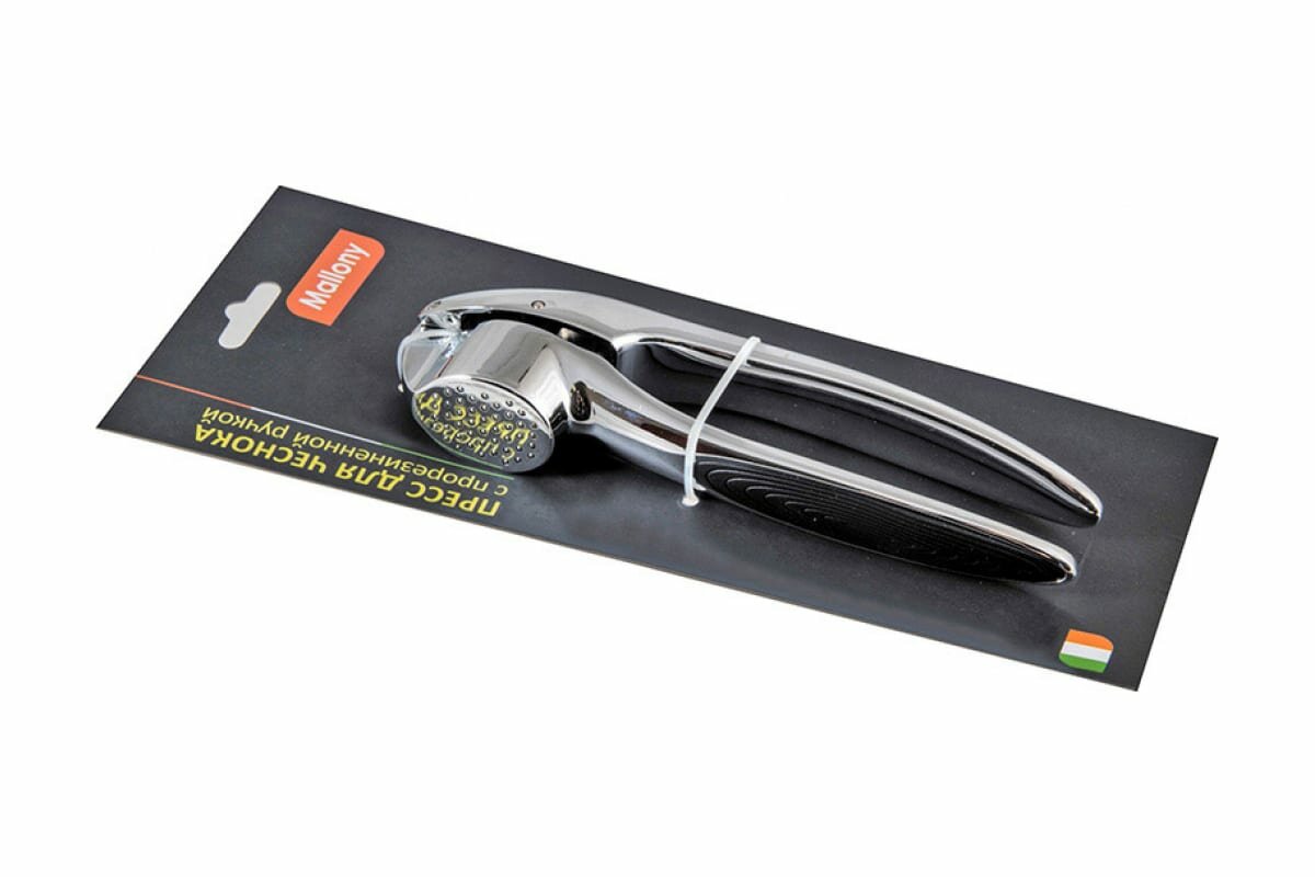 Пресс для чеснока MODERNO, прорезиненная ручка, Mallony Пресс для чеснока - удобный и практичный аксессуар. Он используется для измельчения чеснока и является незаменимым приспособлением на каждой кухне. Пресс для чеснока действует по принципу рычага. Когда мы соединяем рукоятки, плита пресса давит на чашу, в которой находится зубчик. В результате в “тисках” остается тонкая кожица, а чеснок выдавливается через отверстия на дне чаши, превращаясь в однородную массу.