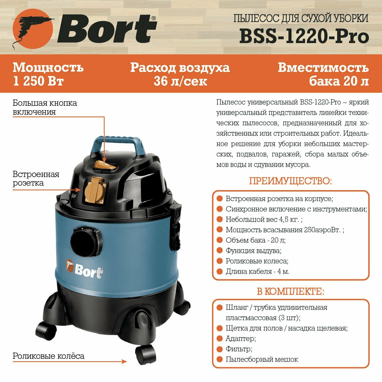 Строительный пылесос BORT - многофункциональное мощное устройство с мотором в 1250 Вт, эффективно устраняющее не только сухой мусор, но и жидкость. Наличие специальных разъемов в модели позволяет подключать к ней различные электрические инструменты: УШМ, рубанок, лобзик и прочее. Благодаря тому, что перечисленные приборы отключаются спустя пару секунд после пылесоса, мусор успевает достигнуть пылесборника объемом в 20 л.