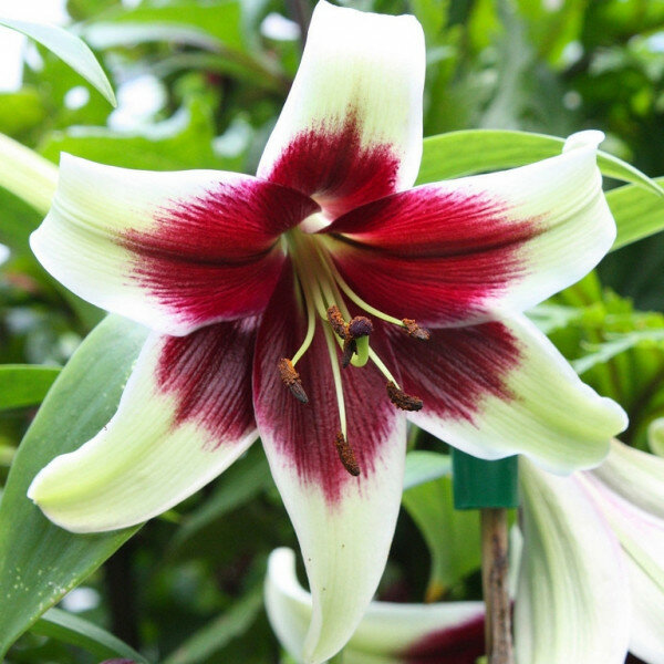 **Лилия видовая Куси Мая** — это экзотическое высокорослое растение с крупными цветками белого цвета с пурпурно-бордовым пятном в центре. Цветок имеет широко открытые лепестки. Цветы можно посадить рядом с кустарниками или вдоль забора, но важно, чтобы солнце попадало на них не меньше половины дня — желательно в первой половине. Предпочтение следует отдать ровному участку или небольшой возвышенности, чтобы избежать застоя воды. К почве лилия не требовательна. Хорошим выбором станут супесчаные и суглинистые почвы. Идеально, если грунт будет богат гумусом. Если участок глинистый, то в него следует внести торф или песок. Луковицы высаживают осенью или весной. Заделывают их на несколько сантиметров с учетом размеров посадочного материала. Ухаживать за цветами очень просто. Они прекрасно обходятся без регулярного полива — даже в знойные дни. Но, чтобы кусты были мощными, а цветение эффектным, их поливают в момент активного роста — примерно раз в неделю. Можно периодически подкармливать лилии. В дальнейшем по мере появления ростков кусты полезно замульчировать органикой, например, перегноем или компостом. Это позволит избежать быстрого высыхания грунта. В некоторых случаях может потребоваться подвязка растения — если стебли стали высокими и при этом истончились. Частая обрезка не требуется. Достаточно удалять засохшие цветочки.