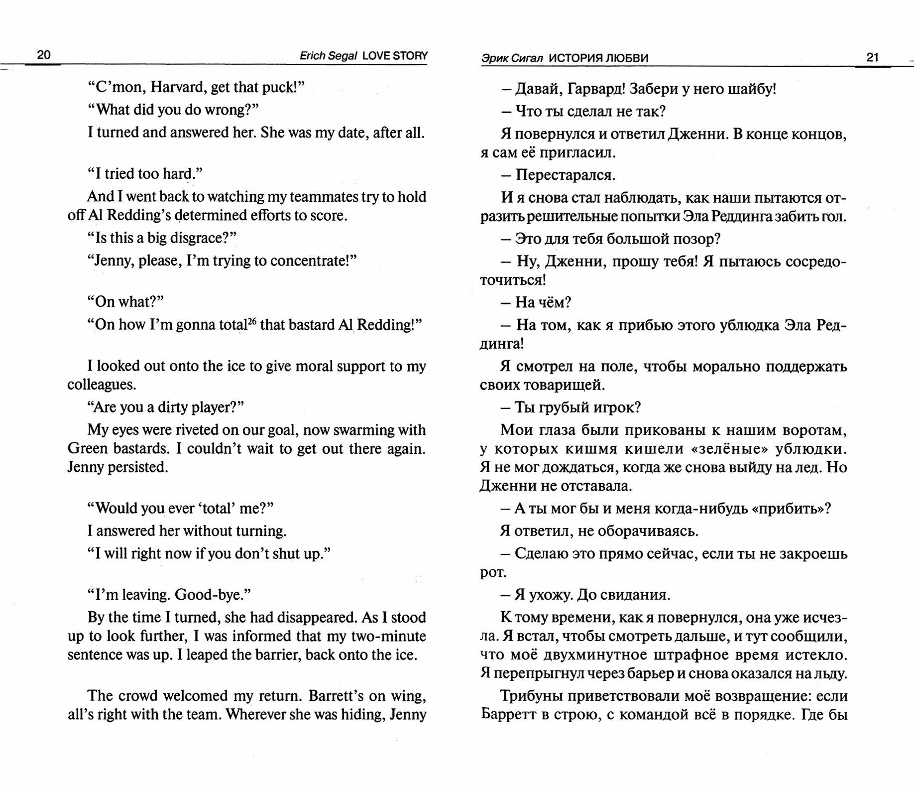 Книга организована по принципу билингвы: произведения опубликованы на языке оригинала с параллельным переводом на русский язык. Пронзительный и честный роман Эрика Сигала читается на одном дыхании - так, как прожили свою историю любви герои. Познакомившись в студенческом кампусе и полюбив друг друга, они готовы преодолеть любые испытания, которые преподносит им жизнь: и разрыв с семьёй, и бедность. Они достойно сражаются за своё счастье и в итоге одерживают победу: они вместе, они богаты и успешны. Но судьба готовит для них трагический сюрприз: Изучение иностранного языка методом параллельного чтения помогает не только значительно расширить словарный запас, но и эффективно работать над усвоением грамматических конструкций и речевых оборотов.