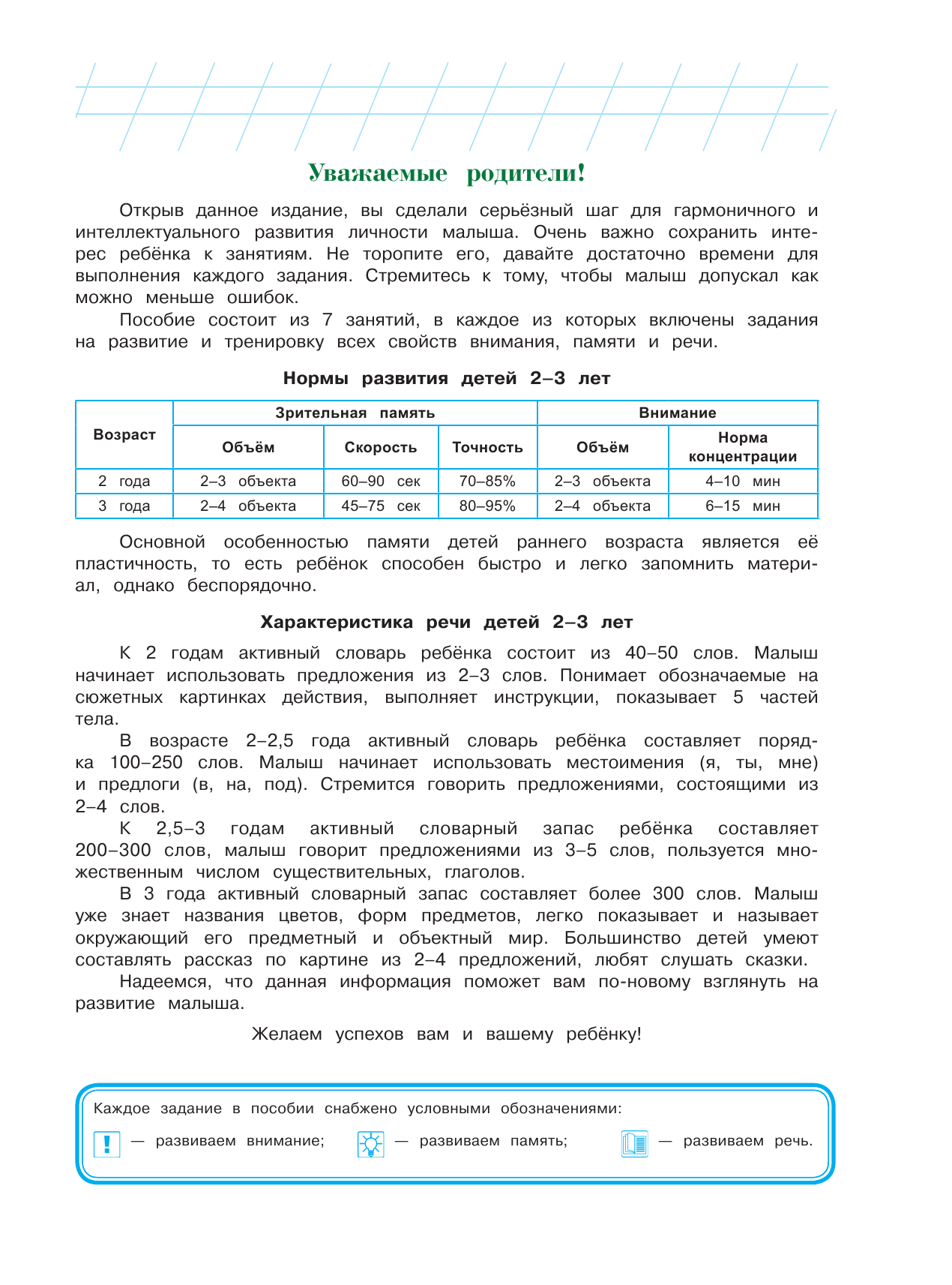 Пособие направлено на развитие основных познавательных процессов ребёнка 2-3 лет - внимания, памяти и речи. Занимаясь по книге, малыш будет выполнять различные задания - находить картинку по описанию, провожать детёнышей животных к их мамам, искать отличия, угощать животных любимыми лакомствами, находить одинаковые предметы, соединять половинки рисунков, проходить простые лабиринты, группировать, классифицировать и т. д. Упражнения расположены по мере усложнения и ориентированы на реальные возможности современных детей.