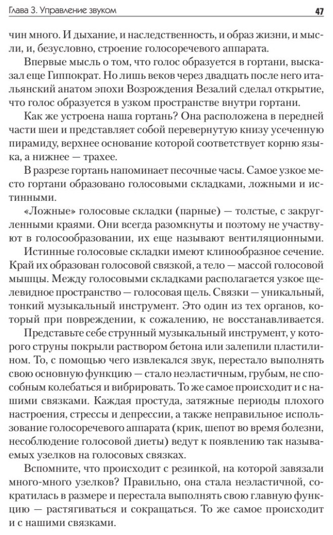 Первая повествует непосредственно о проработке голоса и включает в себя огромное количество упражнений и различных техник. Но, как по мне, дыхательные упражнения описаны не очень качественно. Пришлось смотреть ролики. Думаю, что с картинками для показа движений было бы более понятно.