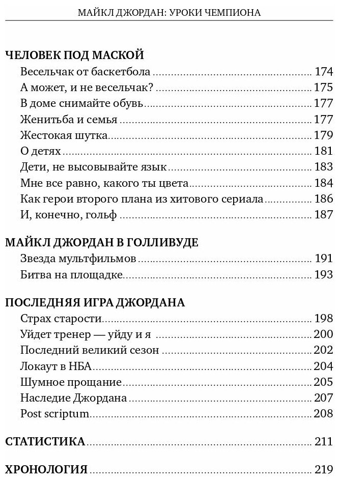 Одна из лучших биографий, которые я когда-либо читал! Страницы летят одна за другой. Книга неимоверно затягивает. Освоил за два присеста. Написана в духе интервью. На каждый факт из жизни Майкла приведена его личная цитата. И это очень интересная находка. Я никогда не встречал такого раньше. Создается впечатление, будто Джордан сидит перед тобой в кресле, а ты интервьюируешь его. Соблюдается четкая хронология событий. Жалко не включен период игры за Вашингтон Уизардс, но этого стоило ожидать, поскольку книга написана в 1999 году. Всем очень советую! Я словно окунулся в события, происходившие в 1980-х и 1990-х гг.