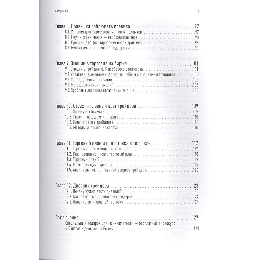 Не могу это даже назвать книгой, больше походит на набор статей с благими напутствиями для трейдера. Практической пользы никакой. Первые 60 страниц этой "книги" (всего из 134) носит чисто описательный характер типичных проблем с которыми сталкивается трейдер - страх, жадность, отсутствие торговой стратегии и т.п. Вторые 60 страниц поданы с занятными советами как такие проблемы решать, по типу - составьте торговый план, ставьте стоп-лоссы, поставьте цель, проговаривайте причины входа вслух, поотжимайтесь, если вы нервничаете и т.п. Автор, вы это серьезно?? Я не говорю что это неправильно, но писать о таких вещах книгу, да это просто смешно. Хотя цель написания мне ясна - это реклама своих курсов, ссылки вставлены буквально через каждые 4 страницы и обладание статусом - я написал книгу. А вот принести пользы трейдерам, целью видимо автором не ставилось. Как только совести у людей выпускать такое хватает. Действительно достойную книгу по психологии трейдера могу посоветовать "Самоучитель трейдера" Бретт Стинбарджер, а на это не тратьте свое время и деньги - ноль пользы. А аналогичная информация и советы рассказывается на бесплатных вводных семинарах у большинства брокеров.