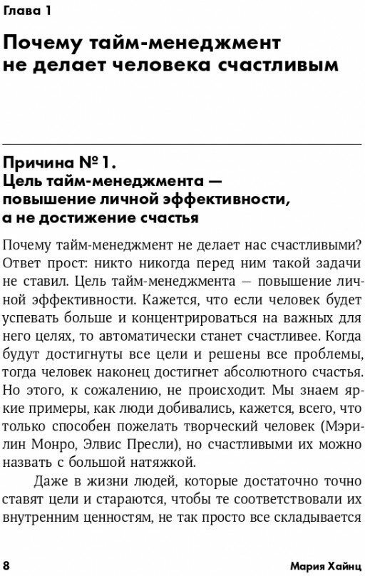 Тайм-менеджмент учит нас: ставь цели, добивайся их — и ты придешь к успеху. Но в бесконечной гонке к новым свершениям мы не становимся счастливее. Даже если основные цели достигнуты, появляются новые желания. Человек никогда не довольствуется тем, что есть, — так он устроен. Как же научиться быть счастливым сегодня? Как радоваться каждому дню? Как правильно планировать свою деятельность в зависимости от эмоционального и физического состояния? В книге Марии Хайнц объединено лучшее из.