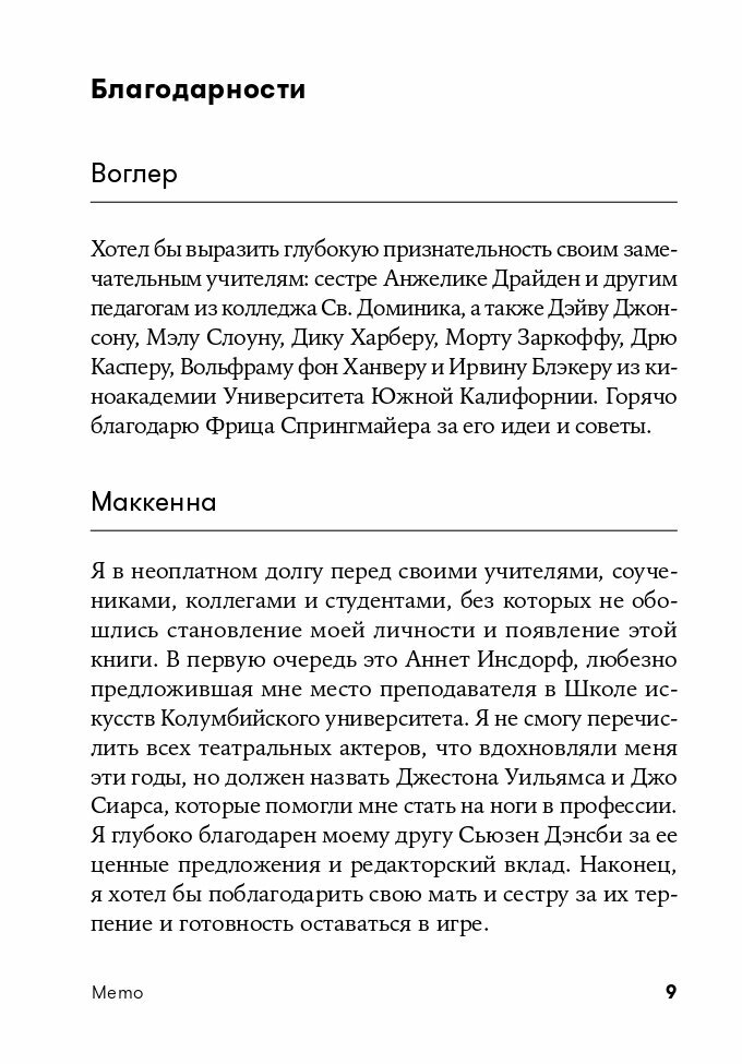 Memo: Секреты создания структуры и персонажей в сценарии / Кристофер Воглер, Дэвид Маккенна ; Пер. с англ. — М.: Альпина нон-фикшн, 2022. — 314 с. — (Серия «Сценарное и писательское мастерство»).