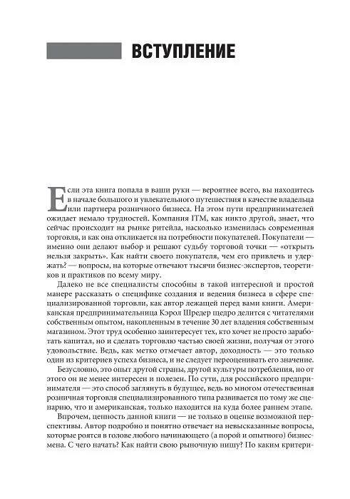 В этой книге есть все, что нужно знать владельцам специализированного магазина. Кэрол Шредер подробно и понятно рассказывает обо всем: от поиска своей ниши, выбора ассортимента и разработки реалистичного бизнес-плана до управления складом и сбытом, ведения учета и организации эффективной рекламной кампании. Кэрол Шредер заряжает читателей своей энергией, которая позволила ей создать один из самых успешных магазинов розничной торговли в Америке. В ее изложении управление собственным магазином — это не только прибыльный бизнес, но и захватывающий творческий процесс.