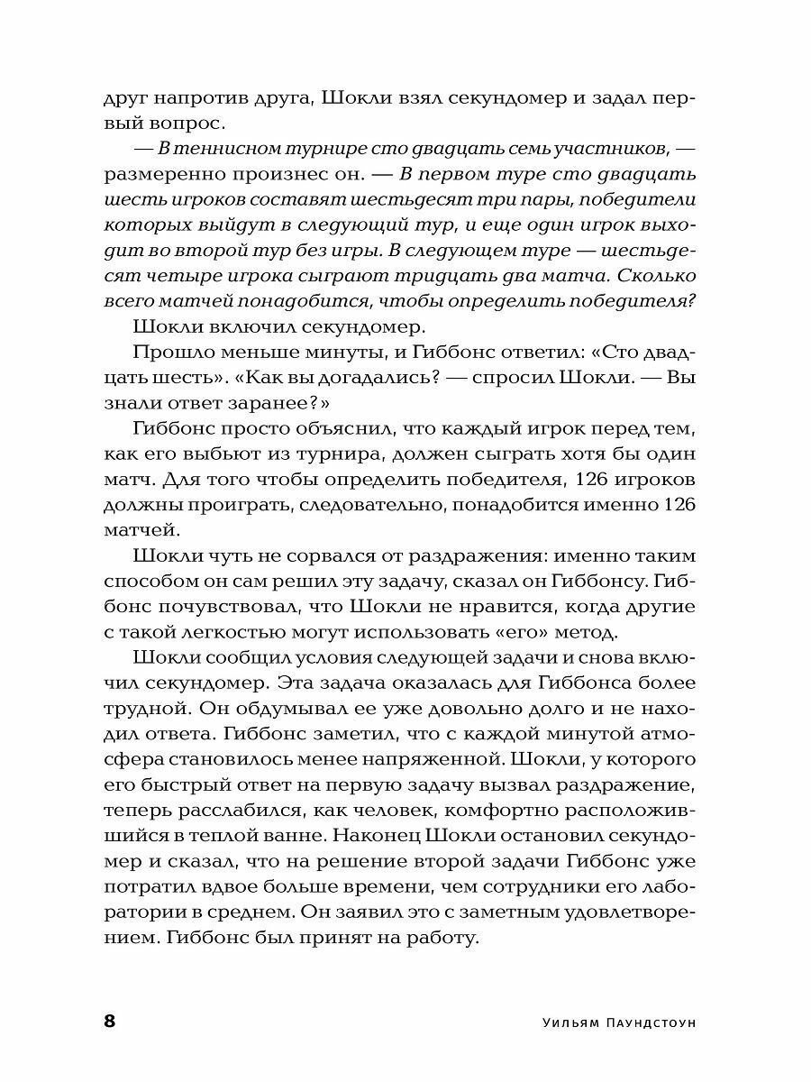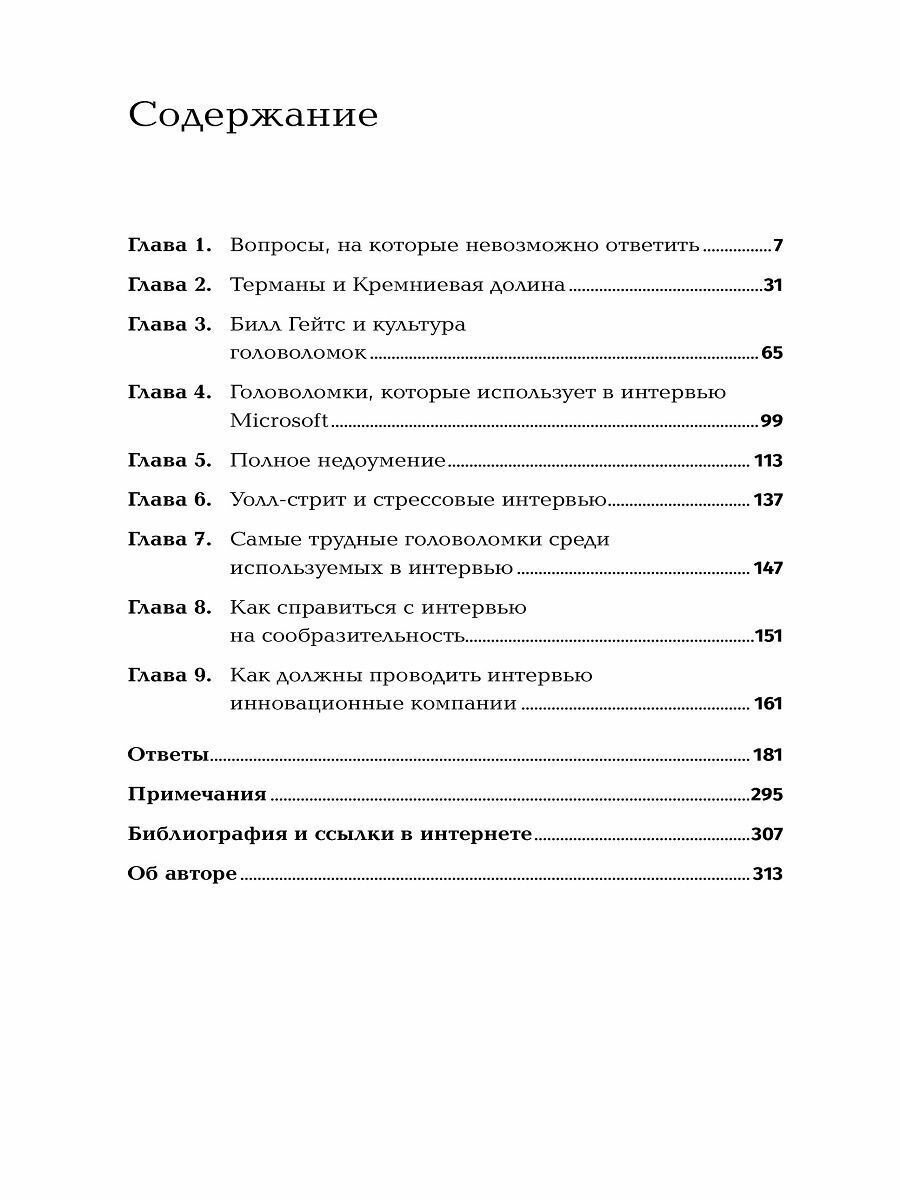 Прочитав эту книгу, вы не растеряетесь, если во время HR-интервью вас вдруг спросят о том, сколько в мире настройщиков пианино, как без помощи весов взвесить реактивный авиалайнер или почему в зеркалах меняются местами правое и левое, а не верх и низ. Впрочем, задачки, над которыми можно поломать голову, – не главное достоинство книги.